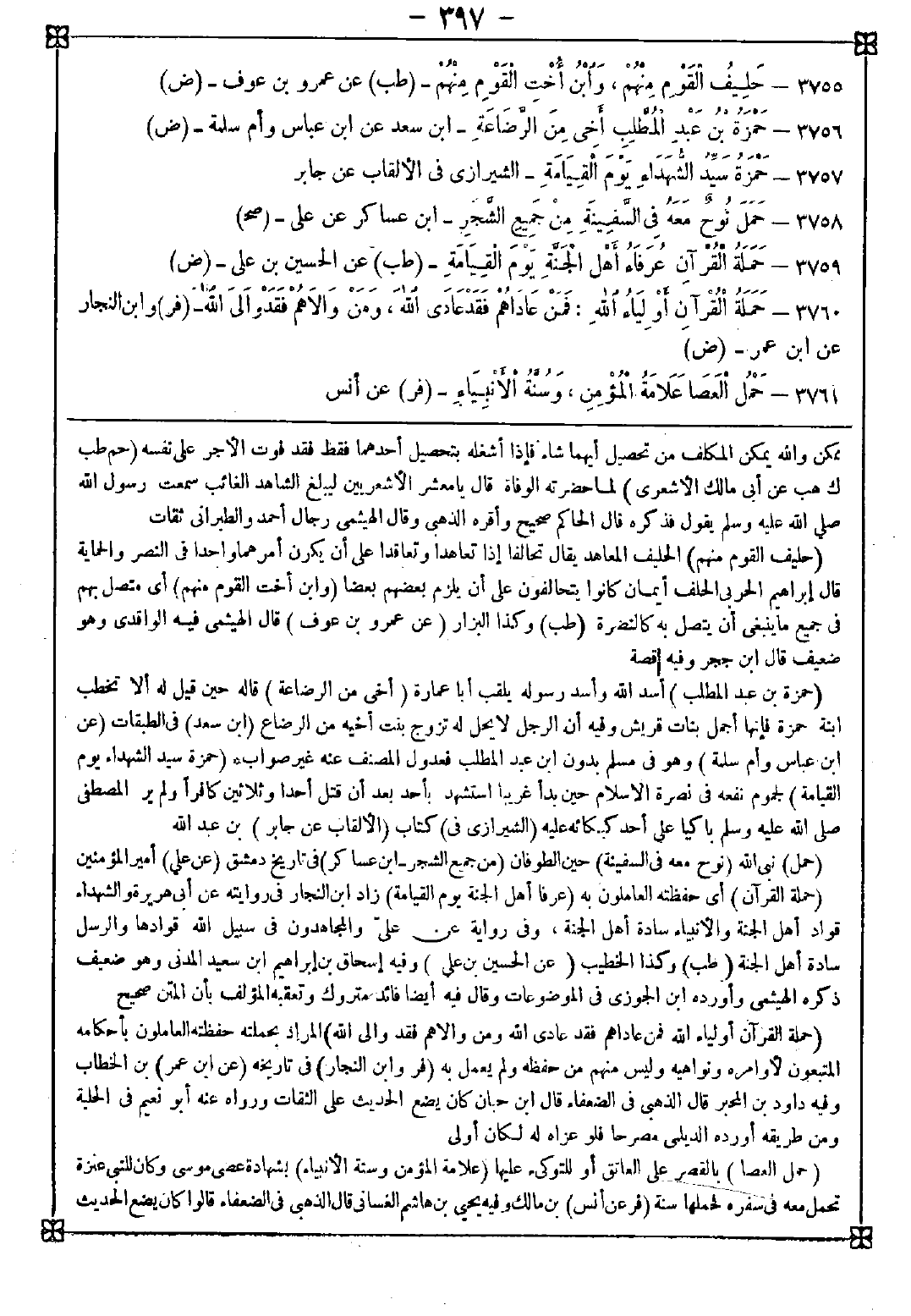 3757 - (حمزة سيد الشهداء يوم القيامة) لجموم نفعه في نصرة الإسلام حين بدأ غريبا استشهد بأحد بعد أن قتل أحدا وثلاثين كافرا ولم ير المصطفى صلى الله عليه وسلم باكيا على أحد كبكائه عليه