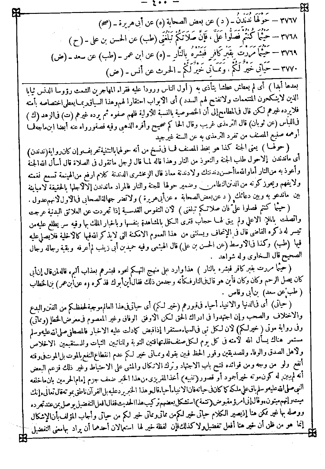 3770 - (حياتي) أي في الدنيا والأنبياء أحياء في قبورهم (خير لكم) أي حياتي في هذا العالم موجبة لحفظكم من الفتن والبدع والاختلاف والصحب وإن اجتهدوا في إدراك الحق لكن الأوفق الوفاق وغير المعصوم في معرض الخطأ (ومماتي) وفي رواية موتي (خير لكم) لأن لكل نبي في السماء مستقرا إذا قبض كما دلت عليه الأخبار فالمصطفى صلى الله عليه وسلم مستمر هناك يسأل الله لأمته في كل يوم لكل صنف فللمتهافتين التوبة وللتائبين الثبات وللمستقيمين الاخلاص ولأهل الصدق الوفاء وللصديقين وفور الحظ فبين بقوله ومماتي خير لكم عدم انقطاع النفع بالموت بل الموت في وقته أنفع ولو من وجه ومن فوائده فتح باب الاجتهاد وترك الإتكال والمشي على الاحتياط وغير ذلك فزعم البعض أنه لم يبين له كون موته خيرا جمود أو قصور <تنبيه> أخذ المقريزي من هذا الخبر ضعف حزم إمام الحرمين بأن ما خلفه النبي صلى الله عليه وسلم باق على ملكه كما كان في حياته فإن الأنبياء أحياء قال: وهذا الخبر يرد عليه بل القرآن ناطق بموته قال تعالى {إنك ميت وإنهم ميتون} وقال إني امرؤ مقبوض (تتمة) استشكل بعضهم تركيب هذا الحديث فقال: أفعل التفضيل يوصل بمن عند تجرده ووصله بها غير ممكن هنا إذ يصير الكلام حياتي خير لكم من مماتي ومماتي خير لكم من حياتي وأجاب المؤلف بأن الإشكال إنما هو من ظن أن خير هنا أفعل تفضيل ولا كذلك فإن لفظة خير لها استعمالان أحدهما أن يراد بها معنى التفضيل -[401]- لا الأفضلية وضدها الشر الثاني أن يراد بها معنى الأفضلية وهي التي توصل بمن وهذه أصلها أخير فحذفت همزتها تخفيفا فخير في هذا الحديث أريد بها التفضيل لا الأفضلية فلا توصل بمن وليست بمعنى أفضل وإنما المقصود أن في كل من حياته ومماته خيرا لا أن هذا خير من هذا ولا هذا خير من هذا