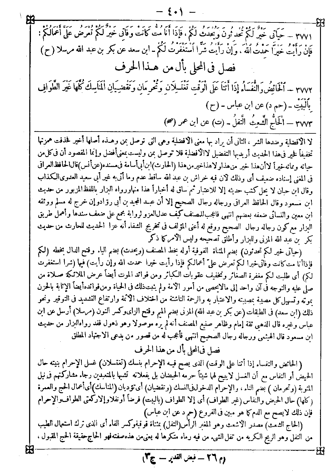 3772 - (الحائض والنفساء إذا أتتا على الوقت) الذي يصح فيه الإحرام بنسك (تغتسلان) غسل الإحرام بنيته حال الحيض أو النفاس مع أن الغسل لا يبيح لهما شيئا حرمه الحيضان بل يفعلانه تشبها بالمتعبدين رجاء مشاركتهم في نيل المثوبة (وتحرمان) بضم التاء والإحرام الدخول في النسك (وتقضيان) أي تؤديان (المناسك) أي أعمال الحج والعمرة (كلها) حال الحيض والنفاس (غير الطواف) أي إلا الطواف (بالبيت) فرضا أو نفلا وإلا ركعتي الطواف والإحرام فإن ذلك لا يصح مع الدم كما هو مبين في الفروع