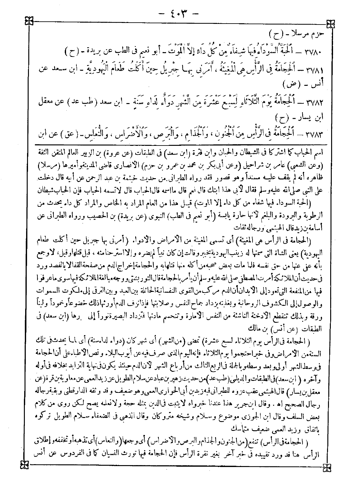 3781 - (الحجامة في الرأس هي المغيثة) أي تسمى المغيثة من الأمراض والأدواء (أمرني بها جبريل حين أكلت طعام اليهودية) يعني الشاة التي سمتها له زينب اليهودية بخبير وقالت: إن كان نبيا لم يضره وإلا استرحنا منه قيل: قتلها وقيل: لا. وجمع: بأنه عفى عنها من حق نفسه فلما مات بعض صحبه من أكله منها قتلها به والحجامة إخراج الدم من صفحة القفا لا بالفصد ورد في حديث أن الملائكة أمرت المصطفى صلى الله عليه وسلم أن يأمر بالحجامة قال التوربشتي: ووجه مبالغة الملائكة فيها سوى ما عرفوا فيها من المنفعة التي تعود إلى الأبدان أن الدم مركب من القوى النفسانية الحائلة بين العبد وبين الترقي إلى ملكوت السماوات والوصول إلى الكشوف الروحانية وبغلبته يزداد جماح النفس وصلابتها فإذا نزف الدم أورثها ذلك خضوعا وخمودا ولينا ورقة وبذلك تنقطع الأدخنة الناشئة من النفس الأمارة وتنحسم مادتها فتزداد البصيرة نورا إلى نورها