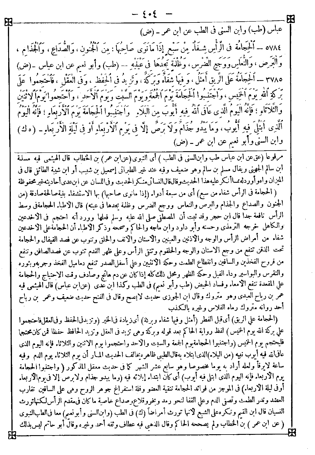3785 - (الحجامة على الريق) أي قبل الفطر (أمثل وفيها شفاء وبركة) أي زيادة في الخير (وتزيد في الحفظ وفي العقل فاحتجموا على بركة الله يوم الخميس) لفظ رواية الحاكم بعد قوله وبركة وهي تزيد في العقل وتزيد الحافظ حفظا فمن كان محتجما فليحتجم يوم الخميس (واجتنبوا الحجامة يوم الجمعة والسبت والأحد واحتجموا يوم الاثنين والثلاثاء فإنه اليوم الذي عافى الله فيه أيوب نبيه (من البلاء) الذي ابتلاه به قال الطيبي: ظاهره يخالف الحديث المار أن يوم الثلاثاء يوم الدم وفيه ساعة لا يرقأ ولعله أراد به يوما مخصوصا وهو سابع عشر الشهر كما في حديث معقل المذكور (واجتنبوا الحجامة يوم الأربعاء فإنه اليوم الذي ابتلى فيه أيوب) أي كان ابتداء إبلائه فيه (وما يبدو جذام ولا برص إلا في يوم الأربعاء أو في ليلة الأربعاء) في الموجز من فوائد الحجامة تنقية العضو وقلة استفراغ جوهر الروح وهي على الساقين تقارب العضد وتدر الطمث وتصفي الدم وعلى القفا لنحو رمد وبخر قلاع وصداع خاصية ما كان في مقدم الرأس لكنها تورث النسيان قال ابن القيم: وتكره على الشبع لأنها تورث أمراضا