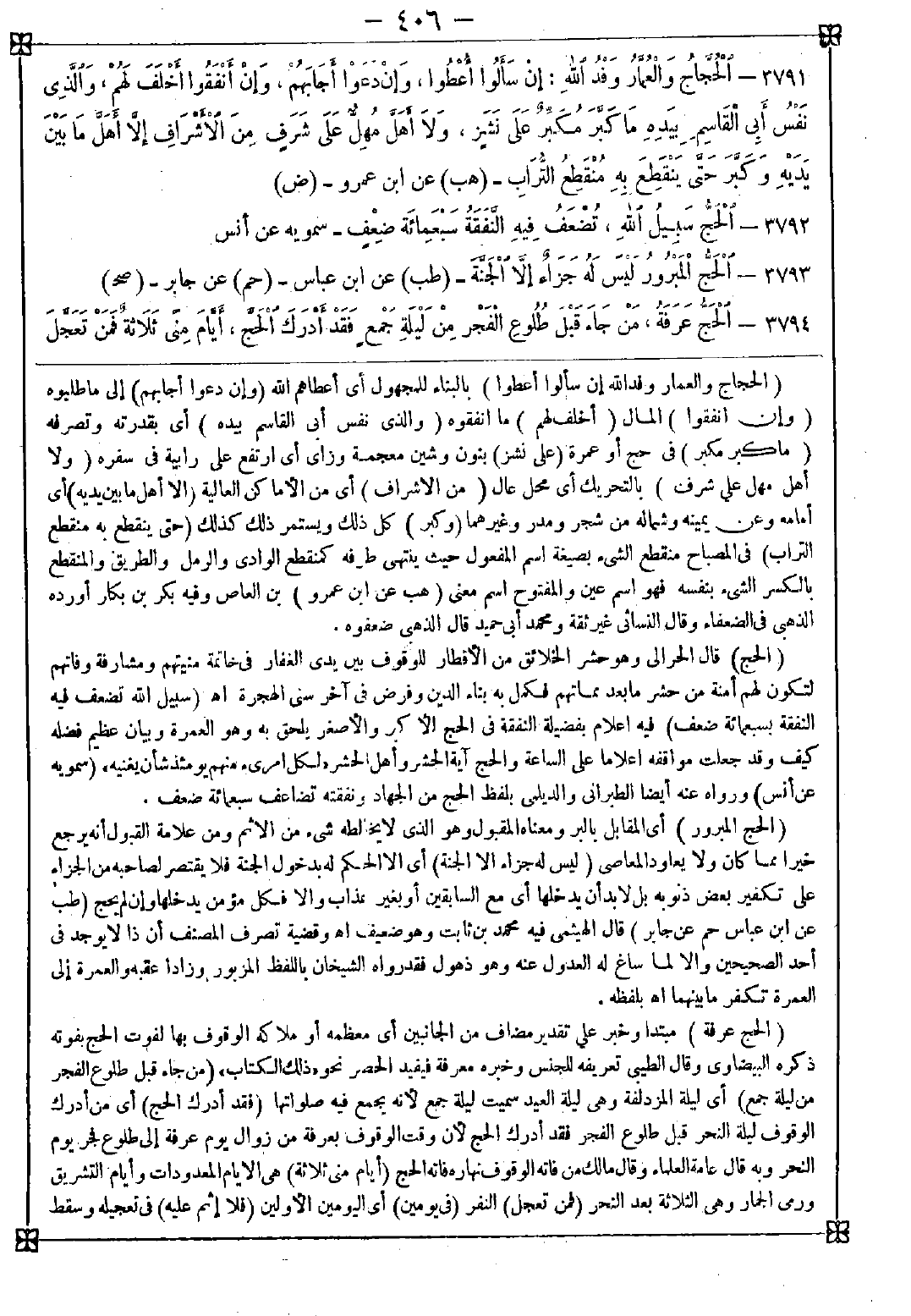 3794 - (الحج عرفة) مبتدأ وخبر على تقدير مضاف من الجانبين أي معظمه أو ملاكه الوقوف بها لفوت الحج بفوته ذكره البيضاوي وقال الطيبي: تعريفه للجنس وخبره معرفة فيفيد الحصر نحو {ذلك الكتاب} (من جاء قبل طلوع الفجر من ليلة الجمع) أي ليلة المزدلفة وهي ليلة العيد سميت ليلة جمع لأنه يجمع صلواتها (فقد أدرك الحج) أي من أدرك الوقوف ليلة النحر قبل طلوع الفجر فقد أدرك الحج لأن وقت الوقوف بعرفة من زوال يوم عرفة إلى طلوع فجر يوم النحر وبه قال عامة العلماء وقال مالك: من فاته الوقوف نهاره فاته الحج (أيام منى ثلاثة) هي الأيام المعدودات وأيام التشريق ورمي الجمار وهي الثلاثة بعد النحر (فمن تعجل) النفر (في يومين) أي اليومين الأولين (فلا إثم عليه) في تعجيله وسقط -[407]- عنه مبيت الليلة الثالثة ورمى اليوم الثالث وتعجل جاء لازما ومتعديا (ومن تأخر) عن النفر في الثاني من التشريق إلى الثالث حتى نفر فيه (فلا إثم عليه) في تأخيره بل هو أفضل والتخيير هنا وقع بين الفاضل والأفضل