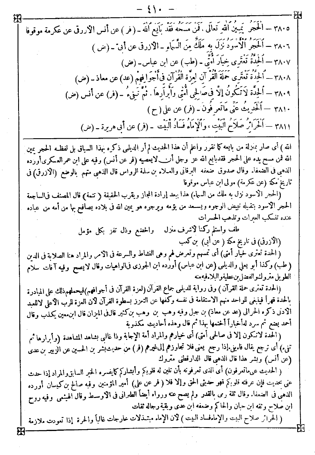 3806 - (الحجر الأسود نزل به ملك من السماء) هذا يبعد إرادة المجاز ويقرب الحقيقة (تتمة) قال المصنف في الساجعة الحجر الأسود بتقبيله تبيض الوجوه ويسعد من يؤمه ويرجوه هو يمين الله في بلاده يصافح بها من أمه من عباده عنده تنسكب العبرات وتذهب الحسرات