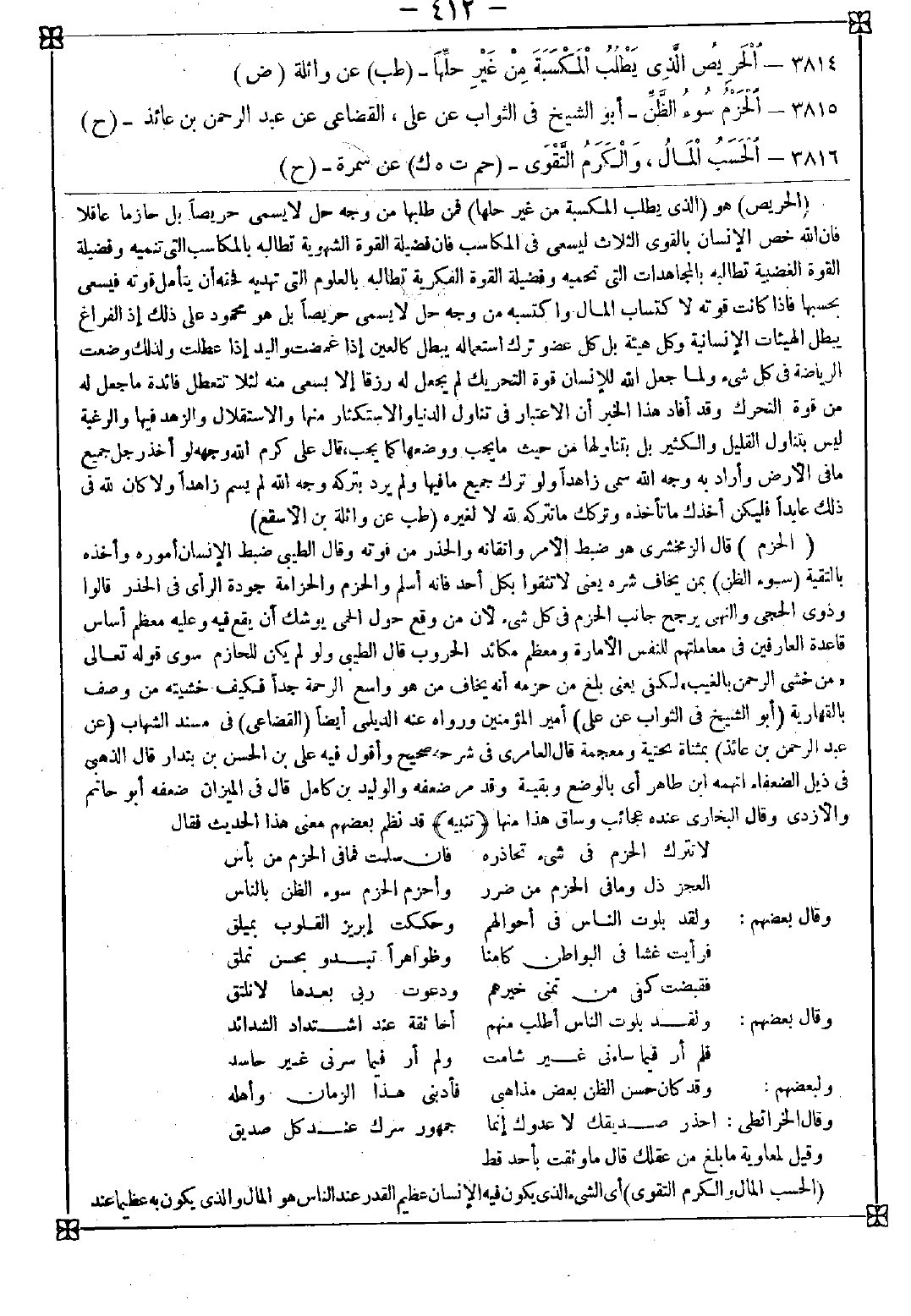 -[412]- 3814 - (الحريص) هو (الذي يطلب المكسبة من غير حلها) فمن طلبها من وجه حل لا يسمى حريصا بل حازما عاقلا فإن الله خص الإنسان بالقوى الثلاث ليسعى في المكاسب فإن فضيلة القوة الشهوية تطالبه بالمكاسب التي تنميه وفضيلة القوة الغضبية تطالبه بالمجاهدات التي تحميه وفضيلة القوة الفكرية تطالبه بالعلوم التي تهديه فحقه أن يتأمل قوته فيسعى بحسبها فإذا كانت قوته لاكتساب المال واكتسبه من وجه حل لا يسمى حريصا بل هو محمود على ذلك إذ الفراغ يبطل الهيئات الإنسانية وكل هيئة بل كل عضو ترك واستعماله يبطل كالعين إذا غمضت واليد إذا عطلت ولذلك وضعت الرياضة في كل شيء ولما جعل الله للإنسان قوة التحريك لم يجعل له رزقا إلا بسعي منه لئلا تتعطل فائدة ما جعل له من قوة التحرك وقد أفاد هذا الخبر أن الاعتبار في تناول الدنيا والاستكثار منها والاستقلال والزهد فيها والرغبة ليس بتناول القليل بل بتناولها من حيث ما يجب ووضعها كما يجب قال علي كرم الله وجهه: لو أخذ رجل جميع ما في الأرض وأراد به وجه الله سمى زاهدا ولو ترك جميع ما فيها ولم يرد بتركه وجه الله لم يسم زاهدا ولا كان لله في ذلك عابدا فليكن أخذك ما تأخذه وتركك ما تتركه لله لا لغيره