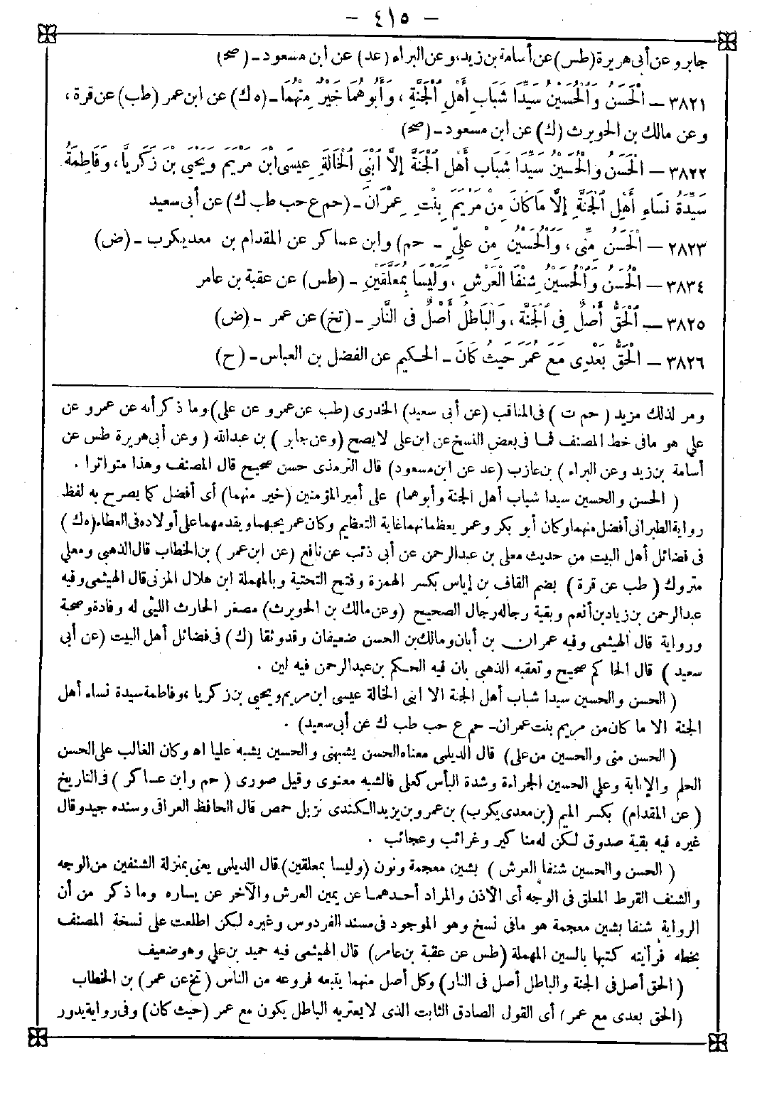 3822 - (الحسن والحسين سيدا أهل الجنة إلا ابني الخالة عيسى ابن مريم ويحيى بن زكريا وفاطمة سيدة نساء أهل الجنة إلا ما كان من مريم بنت عمران)