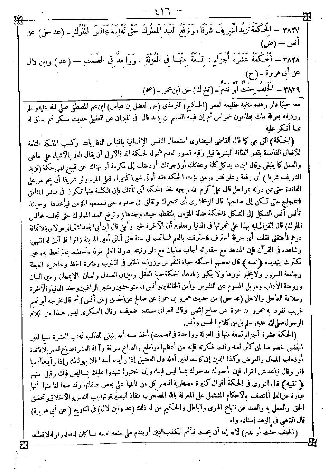 3827 - (الحكمة) التي هي كما قال القاضي البيضاوي: استعمال النفس الإنسانية باقتباس النظريات وكسب الملكة التامة للأفعال الفاضلة بقدر الطاقة البشرية قيل: وفيه قصور لعدم شموله لحكمة الله فالأولى أن يقال العلم بالأشياء على ما هي والعمل كما ينبغي وقال ابن دريد: كل كلمة وعظتك أو زجرتك أو دعتك إلى مكرمة أو نهتك عن قبيح فهي حكمة (تزيد الشريف شرفا) أي رفعة وعلو قدر {ومن يؤت الحكمة فقد أوتي خيرا كثيرا} فعلى المرء ولو شريفا أن يحرص على الفائدة حتى ممن دونه بمراحل قال علي كرم الله وجهه: خذ الحكمة أنى تأتك فإن الكلمة منها تكون في صدر المنافق فتتلجلج حتى تسكن إلى صاحبها قال الزمخشري: أي تتحرك وتفلق في صدره حتى يسمعها المؤمن فيأخذها وحينئذ تأنس أنس الشكل إلى الشكل فالحكمة ضالة المؤمن يلتقطها حيث وجدها (وترفع العبد المملوك حتى تجلسه مجالس الملوك) قال الغزالي: نبه على غمرتها في الدنيا ومعلوم أن الآخرة خير وأبقى قال ابن أبي الجعد: اشتراني مولاي بثلاث مئة درهم فأعتقني فقلت: بأي حرفة أحترف فاحترفت بالعلم فما تمت لي سنة حتى أتاني أمير المدينة زائرا فلم آذن له انتهى وشاهده في القرآن فإن الهدهد مع حقارته أجاب سليمان مع علو رتبته بصولة العلم بقوله {أحطت بما لم تحط به} غير مكترث بتهديده <تنبيه> قال بعضهم: الحكمة حياة النفوس وزراعة الخير في القلوب ومثيرة الحظ وحاضرة الغبطة وجامعة السرور ولا يخبو نورها ولا يكبو زنادها الحكمة حلية العقل وميزان العدل ولسان الإيمان وعين البيان وروضة الآداب ومزيل الهموم عن النفوس وأمن الخائفين وأنس المستوحشين ومتجر الراغبين وحظ الدنيا والآخرة وسلامة العاجل والآجل