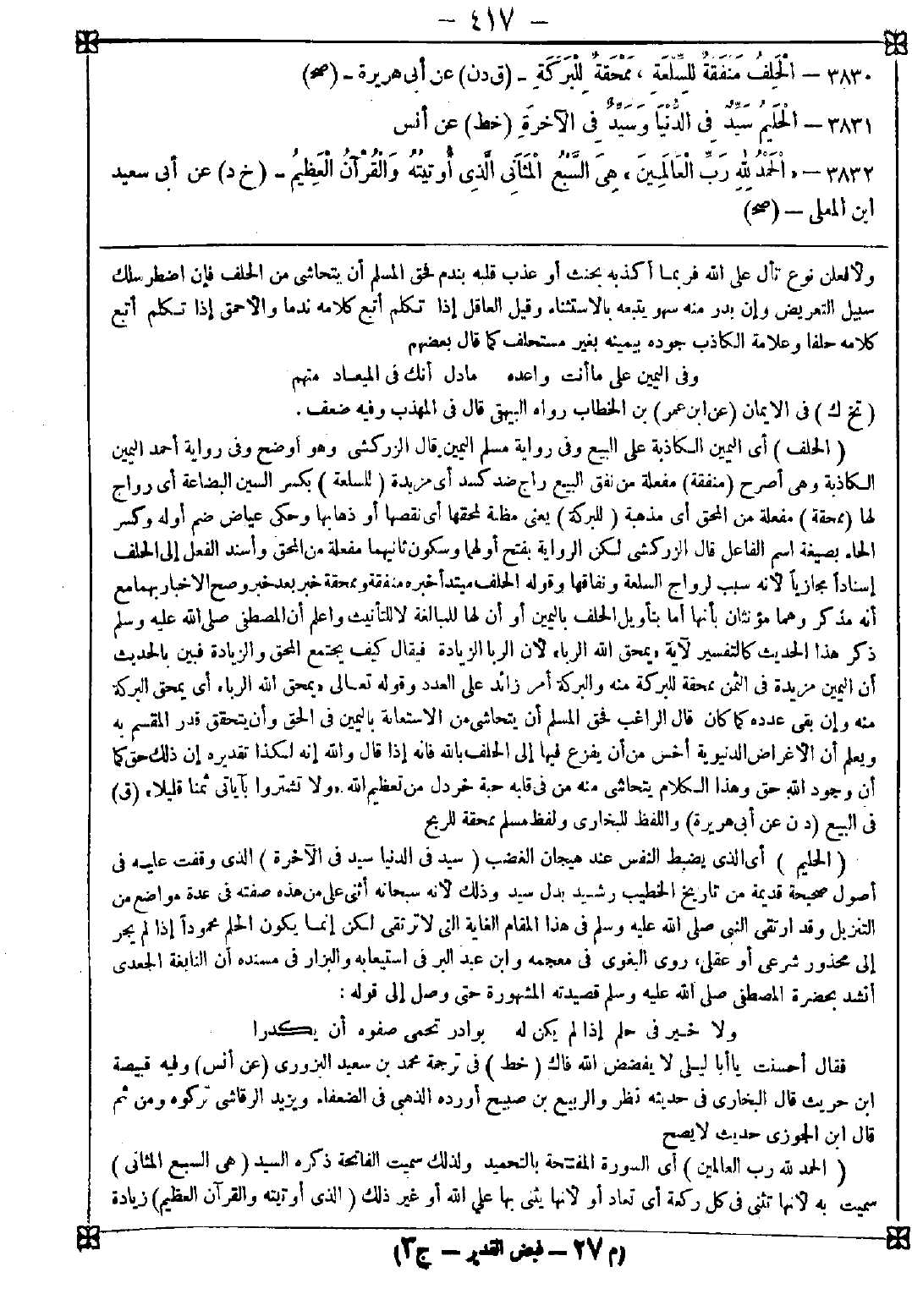 3832 - (الحمد لله رب العالمين) أي السورة المفتتحة بالتحميد ولذلك سميت الفاتحة ذكره السيد (هي السبع المثاني) سميت به لأنها تثنى في كل ركعة أي تعاد أو لأنها يثنى بها على الله أو غير ذلك (الذي أوتيته والقرآن العظيم) زيادة -[418]- على الفاتحة
