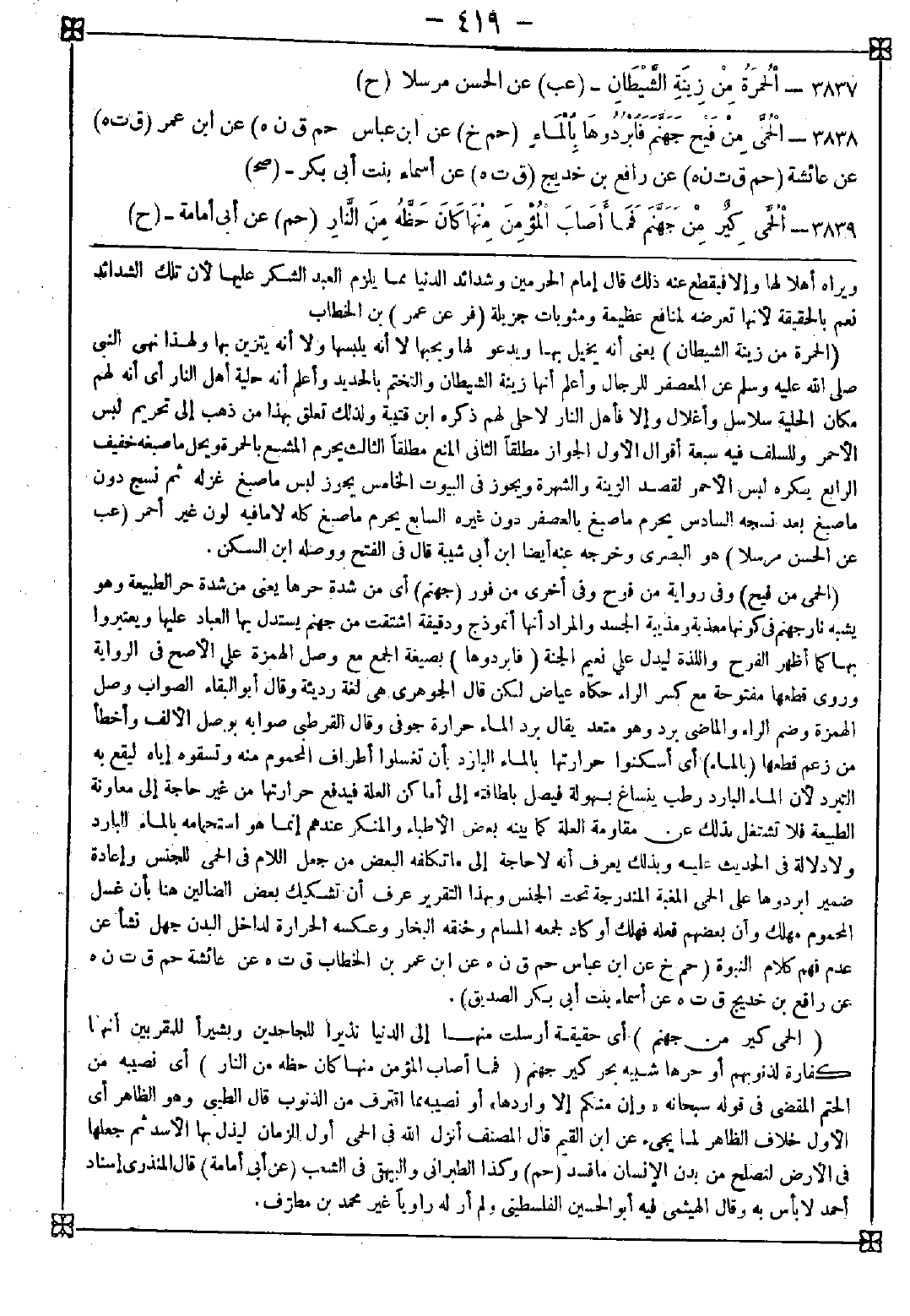 3839 - (الحمى كير من جهنم) أي حقيقة أرسلت منها إلى الدنيا نذيرا للجاحدين وبشيرا للمقربين أنها كفارة لذنوبهم أو حرها شبيه بحر كير جهنم (فما أصاب المؤمن منها كان حظه من النار) أي نصيبه من الحتم المقضي في قوله سبحانه {وإن منكم إلا واردها} أو نصيبه مما اقترف من الذنوب قال الطيبي: وهو الظاهر أي الأول خلاف الظاهر لما يجيء عن ابن القيم قال المصنف: أنزل الله في الحمى أول الزمان ليذل بها الأسد ثم جعلها في الأرض لتصلح من بدن الإنسان ما فسد