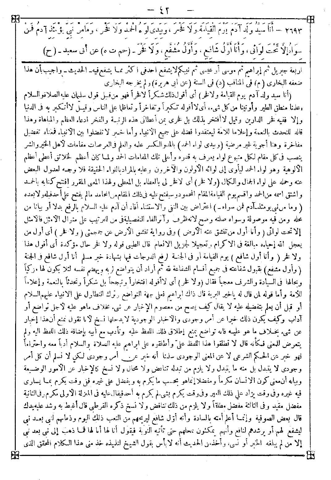 2693 - (أنا سيد ولد آدم يوم القيامة ولا فخر) أي أقول ذلك شكرا لا فخرا من قبيل قول سليمان عليه الصلاة والسلام {علمنا منطق الطير وأوتينا من كل شيء} أي لا أقوله تكبرا وتفاخرا وتعاظما على الناس وقيل لا أتكبر به في الدنيا وإلا ففيه فخر الدارين وقيل لا أفتخر بذلك بل فخري بمن أعطاني هذه الرتبة والفخر ادعاء العظم والمباهاة وهذا قاله للتحدث بالنعمة وإعلاما للأمة ليعتقدوا فضله على جميع الأنبياء وأما خبر لا تفضلوا بين الأنبياء فمعناه تفضيل مفاخرة وهنا أجوبة غير مرضية (وبيدي لواء الحمد) بالمد والكسر علمه والعلم في العرصات مقامات لأهل الخير والشر ينصب في كل مقام لكل متبوع لواء يعرف به قدره وأعلى تلك المقامات الحمد ولما كان أعظم الخلائق أعطي أعظم الألوية وهو لواء الحمد ليأوي إلى لوائه الأولون والآخرون وعليه فالمراد باللواء الحقيقة فلا وجه لعدول البعض عنه وحمله على لواء الجمال والكمال (ولا فخر) أي لا فخر لي بالعطاء بل المعطي ولهذا المعنى المقرر افتتح كتابه بالحمد واشتق اسمه من الحمد وأقيم يوم القيامة المقام المحمود وسيفتح عليه في ذلك المقام من المحامد ما لم يفتح على أحد قبله ولا بعده (وما من نبي يومئذ - آدم فمن سواه -) اعتراض بين النفي والاستثناء أفاد أن آدم عليه السلام بالرفع بدلا أو بيانا من محله ومن فيه موصولة وسواه صلته وصح لأنه ظرف وآثر الفاء التفصيلية في من للترتيب على منوال الأمثل فالأمثل إلا تحت لوائي (وأنا أول من تنشق عنه الأرض) وفي رواية تنشق الأرض عن جمجمتي (ولا فخر) أي أول من يعجل الله إحياءه مبالغة في الإكرام وتعجيلا لجزيل الإنعام قال الطيبي: قوله ولا فخر حال مؤكدة أي أقول هذا ولا فخر (وأنا أول شافع) يوم القيامة أو في الجنة لرفع الدرجات فيها بشهادة خبر مسلم أنا أول شافع في الجنة (وأول مشفع) بقبول شفاعته في جميع أقسام الشفاعة لله ثم أراد أن يتواضع لربه ويهضم نفسه لئلا يكون لها مزكيا وبحالها في السيادة والشرف معجبا فقال (ولا فخر) أي لا أقوله افتخارا وتبجحا بل شكرا وتحدثا بالنعمة وإعلاما للأمة وأما قوله لمن قال له يا خير البرية قال: ذاك إبراهيم فعلى جهة التواضع وترك التطاول على الأنبياء عليهم السلام أو قبل أن يعلم بتفضيله عليه لا يقال كيف يصح من معصوم الإخبار عن شيء بخلاف ما هو عليه لأجل تواضع أو آداب وكيف يكون ذلك خبرا عن أمر وجودي والأخبار الوجودية لا يدخلها نسخ لأن نقول نمنع أن هذا إخبار عن شيء بخلاف ما هو عليه فإنه تواضع يمنع إطلاق ذلك اللفظ عليه وتأدب مع أبيه بإضافة ذلك اللفظ إليه ولم يتعرض للمعنى فكأنه قال لا تطلقوا هذا اللفظ علي وأطلقوه على إبراهيم عليه الصلاة والسلام أدبا معه واحتراما فهو خبر عن الحكم الشرعي لا عن المعنى الوجودي سلمنا أنه خبر عن أمر وجودي لكن لا نسلم أن كل أمر وجودي لا يتبدل بل منه ما يتبدل ولا يلزم من تبدله تناقض ولا محال ولا نسخ كالإخبار عن الأمور الوضيعة وبيانه أن معنى كون الإنسان مكرما ومفضلا إنما هو بحسب ما يكرم به ويفضل على غيره ففي وقت يكرم بما يساوي فيه غيره وفي وقت يزاد على ذلك العير وفي وقت يكرم بشيء لم يكرم به أحد فيقال عليه في المنزلة الأولى مكرم وفي الثانية مفضل مقيد وفي الثالثة مفضل مطلقا ولا يلزم من ذلك تناقض ولا نسخ ذكره القرطبي قال: أغبط به وشد عليه يدك قال بعض الصوفية: وإنما أعلم أمته بالسادة وأنه أول شافع ليريحهم من التعب ذلك اليوم وذهابهم لنبي بعد نبي ليشفع لهم أو يرشدهم لنافع وأنهم يمكثون بمحلهم حتى تأتيه النوبة فيقول: أنا لها أنا لها فما ذهب إلي نبي بعد نبي إلا من لم يبلغه الخبر أو نسي وأخذ من الحديث أنه لا بأس بقول الشيخ لتلميذه: خذ مني هذا الكلام المحقق الذي -[43]- لا تجده عند غيري أو نحو ذلك بقصد اعتنائه وعدم تهاونه به. (تتمة) قالوا في الخصائص: خص نبينا صلى الله عليه وسلم بالشفاعة العظمى في فصل القضاء وبالشفاعة في إدخال قوم الجنة بغير حساب وبالشفاعة فيمن استحق النار لا يدخلها والشفاعة في رفع درجات ناس في الجنة كما جوز النووي اختصاص هذه وال