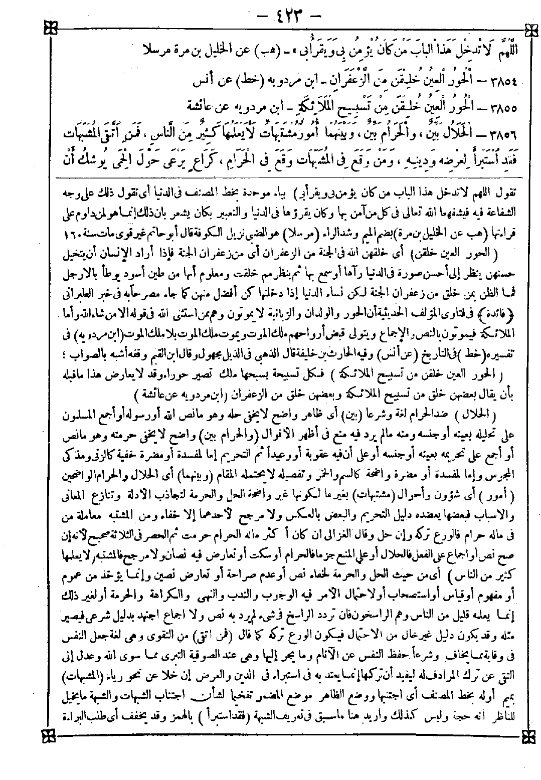 3856 - (الحلال) ضد الحرام لغة وشرعا (بين) أي ظاهر واضح لا يخفى حله وهو ما نص الله أو رسوله وأجمع المسلمون على تحليله بعينه أو جنسه ومنه ما لم يرد فيه منع في أظهر الأقوال (والحرام بين) واضح لا يخفى حرمته وهو ما نص أو أجمع على تحريمه بعينه أو جنسه أو على أن فيه عقوبة أو وعيدا ثم التحريم إما لمفسدة أو مضرة خفية كالزني ومذكي المجوس وإما لمفسدة أو مضرة واضحة كالسم والخمر وتفصيله لا يحتمله المقام (وبينهما) أي الحلال والحرام الواضحين (أمور) أي شؤون وأحوال (مشتبهات) بغيرها لكونها غير واضحة الحل والحرمة لتجاذب الأدلة وتنازع المعاني والأسباب فبعضها يعضده دليل التحريم والبعض بالعكس ولا مرجح لأحدهما إلا خفاء ومن المشتبه معاملة من في ماله حرام فالورع تركه وإن حل وقال الغزالي: إن كان أكثر ماله الحرام حرمت ثم الحصر في الثلاثة صحيح لأنه إن صح نص أو إجماع على الفعل فالحلال أو على المنع جزما فالحرام أو سكت أو تعارض فيه نصان ولا مرجح فالمشتبه (لا يعلمها كثير من الناس) أي من حيث الحل والحرمة لخفاء نص أو عدم صراحة أو تعارض نصين وإنما يؤخذ من عموم أو مفهوم أو قياس أو استصحاب أو لاحتمال الأمر فيه الوجوب والندب والنهي والكراهة والحرمة أو لغير ذلك إنما يعلمه قليل من الناس وهم الراسخون فان تردد الراسخ في شيء لم يرد فيه نص ولا إجماع اجتهد بدليل شرعي فيصير مثله وقد يكون دليل غير خال من الاحتمال فيكون الورع تركه كما قال (فمن اتقى) من التقوى وهي لغة جعل النفس في وقاية مما يخاف وشرعا حفظ النفس عن الآثام وما يجر إليها وهي عند الصوفية التبري مما سوى الله وعدل إلى التقى عن ترك المرادف له ليفيد أن تركها إنما يعتد به في استبراء في الدين والعرض إن خلا عن نحو رياء (المشبهات) بميم أوله بخط المصنف أي اجتنبها ووضع الظاهر موضع المضمر تفخيما لشأن اجتناب الشبهات والشبهة ما يخيل للناظر أنه حجة وليس كذلك وأريد هنا ما سبق في تعريف الشبهة (فقد أستبرأ) بالهمز وقد يخفف أي طلب البراءة -[424]- (لدينه) من الدم الشرعي (وعرضه) بصونه عن الوقيعة فيه بترك الورع الذي أمر به فهو هنا الحسب وقيل النفس لأنها الذي يتوجه إليها المدح والذم وعطف العرض على الدين ليفيد أن طلب براءته منظور إليه كالدين (ومن وقع في المشبهات) بميم بخطه أيضا يعني فعلها وتعودها (وقع في الحرام) أي يوشك أن يقع فيه لأنه حام حول حريمه وقال وقع دون يوشك أن يقع كما قال في المشبه به الآتي لأن من تعاطى المشبهات صادف الحرام وإن لم يتعمده إما لإثمه بسبب تقصيره في التحري أو لاعتياده التساهل وتجرئه على شبهة بعد أخرى إلى أن يقع في الحرام أو تحقيقا لمداناة الوقوع كما يقال من اتبع هواه هلك وسره أن حمى الملوك محسوسة يحترز عنها كل بصير وحمى الله لا يدركه إلا ذو البصائر ولما كان فيه نوع خفاء ضرب المثل بالمحسوس بقوله (كراع) أصله الحافظ بغيره ومنه قيل للوالي راعي والعامة رعية وللزوج راع ثم خص عرفا بحافظ الحيوان كما هنا (يرعى حول الحمى) أي المحمى وهو المحذور على غير مالكه (يوشك) بكسر الشين يسرع (أن يواقعه) أي تأكل ماشيته منه فيعاقب شبه آخذ الشهوات بالراعي والمحارم بالحمى والشبهات بما حوله ثم أكد التحذير من حيث المعنى بقوله (ألا) حرف افتتاح قصد به أمر السامع بالإصغاء لعظم موقع ما بعده (وإن لكل ملك) من ملوك العرب (حمى) يحميه عن الناس ويتوعد من قرب منه بأشد العقوبات (ألا وإن حمى الله) تعالى وهو ملك الملوك (في أرضه محارمه) أي المحارم التي حرمها وأريد به هنا ما يشمل المنهيات وترك المأمور ومن دخل حمى الله بارتكاب شيء منها استحق العقاب ومن قاربه يوشك الوقوع فيه فالمحافظ لدينه لا يقرب مما يقرب إلا الخطيئة والقصد إقامة البرهان على تجنب الشبهات وأنه إذا كان حمى الملك يحترز منه خوف عقابه فحمى الحق أولى لكون عذابه أشق ولما كان التورع يميل القلب إلى الصلاح وعدمه إلى الفجور أردف ذلك بقوله (ألا وإن في الجسد) أي البدن (مضغة) قطعة لحم بقدر ما يمضغ لكنها وإن صغرت حجما عظمت قدرا ومن ثم كانت (إذا صلحت) بفتح اللام انشرحت باله