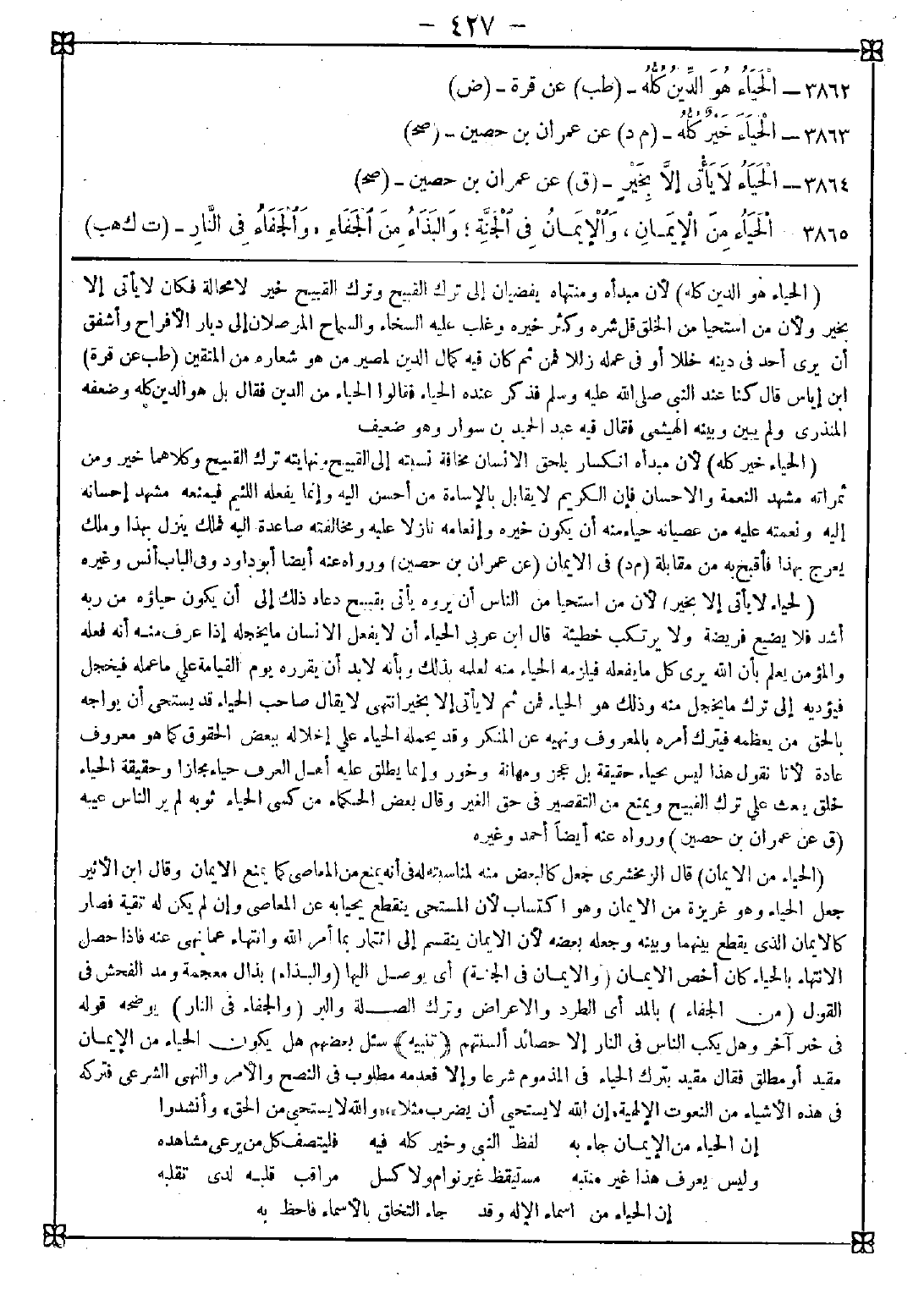 -[427]- 3862 - (الحياء هو الدين كله) لأن مبدأه ومنتهاه يفضيان إلى ترك القبيح وترك القبيح خير لا محالة فكان لا يأتي إلا بخير ولأن من استحيا من الخلق قل شره وكثر خيره وغلب عليه السخاء والسماح الموصلان إلى ديار الأفراح وأشفق أن يرى أحد في دينه خللا أو في عمله زللا فمن ثم كان فيه كمال الدين لمصير من هو شعاره من المتقين