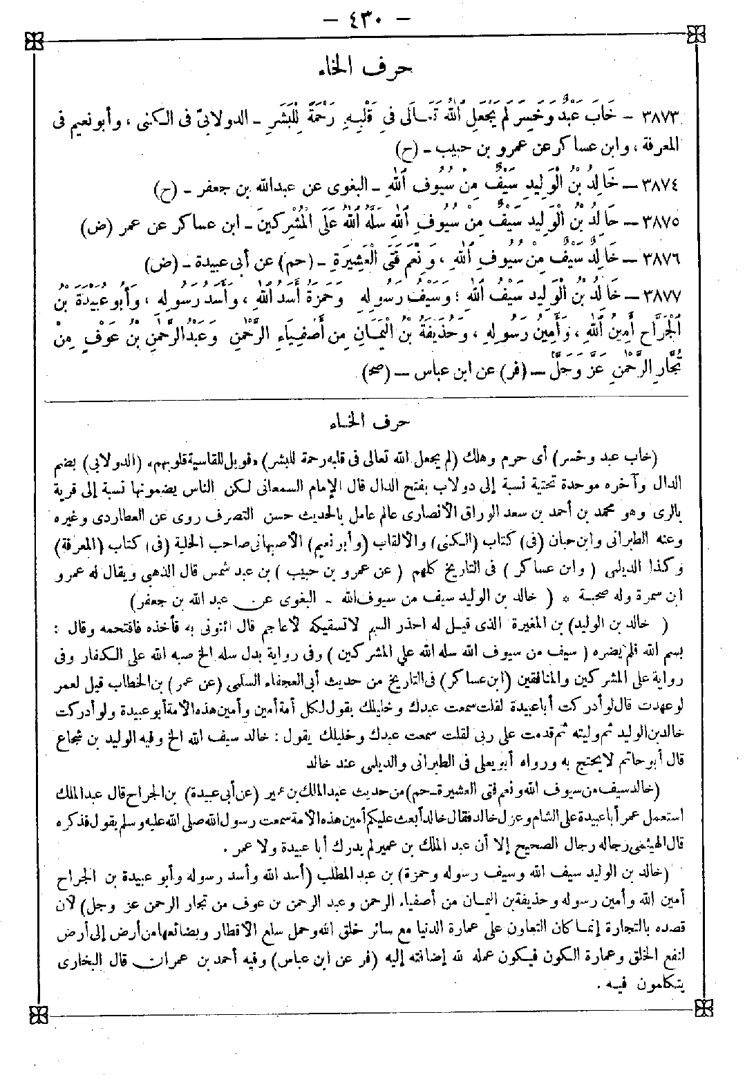 3877 - (خالد بن الوليد سيف الله وسيف رسوله وحمزة) بن عبد المطلب (أسد الله وأسد رسوله وأبو عبيدة بن الجراح أمين الله وأمين رسوله وحذيفة بن اليمان من أصفياء الرحمن وعبد الرحمن بن عوف من تجار الرحمن عز وجل) لأن قصده بالتجارة إنما كان بالتعاون على عمارة الدنيا مع سائر خلق الله وحمل سلع الأقطار وبضائعها من أرض إلى أرض لنفع الخلق وعمارة الكون فيكون عمله لله إضافته إليه