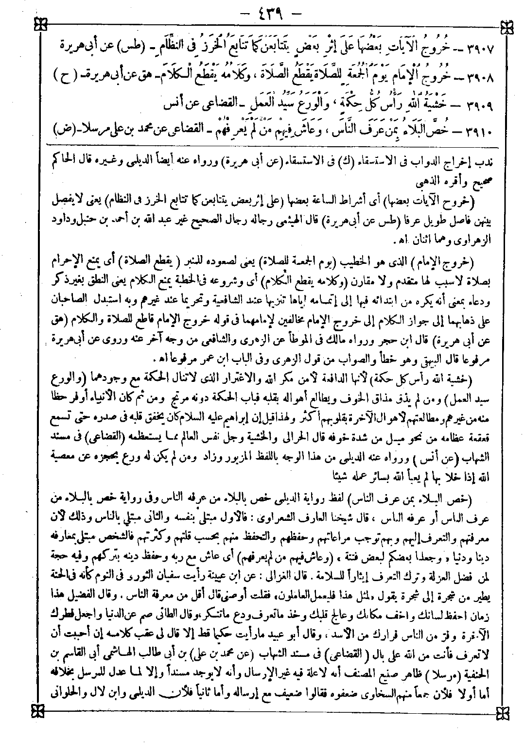 3909 - (خشية الله رأس كل حكمة) لأنها الدافعة لأمن مكر الله والاغترار الذي لا تنال الحكمة مع وجودهما (والورع سيد العمل) ومن لم يذق مذاق الخوف ويطالع أهواله بقلبه فباب الحكمة دونه مرتج ومن ثم كان الأنبياء أوفر حظا منه من غيرهم ومطالعتهم لأهوال الآخرة بقلوبهم أكثر ولهذا قيل إن إبراهيم عليه السلام كان يخفق قلبه في صدره حتى تسمع قعقعة عظامه من نحو ميل من شدة خوفه قال الحرالي والخشية وجل نفس العالم مما يستعظمه