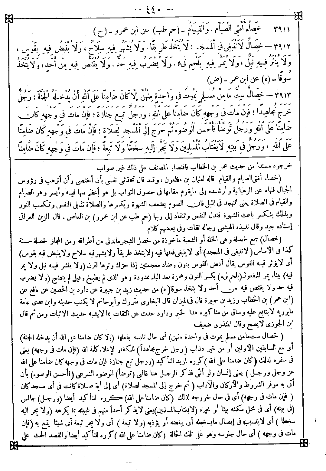 3912 - (خصال) جمع خصلة وهي الخلة أو الشعبة مأخوذة من خصل الشجر ما تدلى من أطرافه ومن المجاز خصلة حسنة كذا في الأساس (لا تنبغي في المسجد) أي لا ينبغي فعلها فيه (لا يتخذ طريقا ولا يشهر فيه سلاح ولا ينبض فيه بقوس) أي لا يؤثر فيه القوس يقال أبيض القوس بنون وضاد معجمتين إذا حرك وترها لترن (ولا ينشر فيه نبل ولا يمر فيه) ببناء يمر للمفعول (بلحم نيء) بكسر النون وهمزة بعد الياء ممدودة وهو الذي لم يطبخ وقيل لم ينضج (ولا يضرب فيه حد ولا يقتص فيه من أحد ولا يتخذ سوقا)