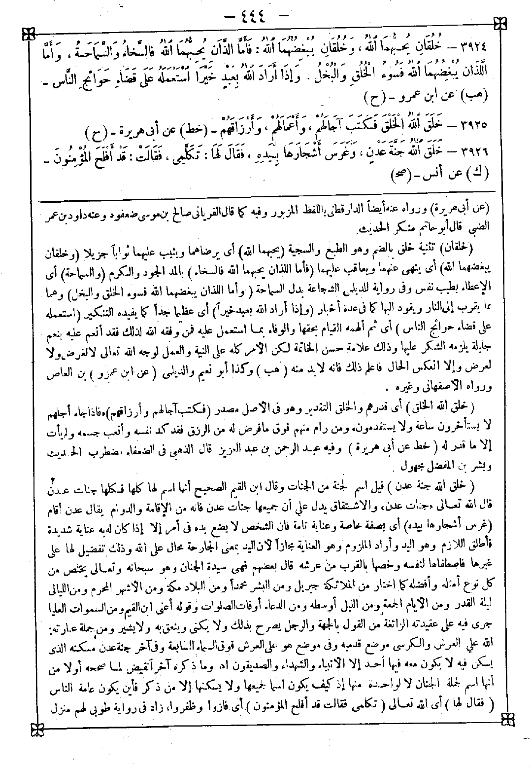 3926 - (خلق الله جنة عدن) قيل اسم لجنة من الجنات وقال ابن القيم: الصحيح أنها اسم لها كلها فكلها جنات عدن قال الله تعالى {جنات عدن} والاشتقاق يدل على أن جميعها جنات عدن فإنه من الإقامة والدوام يقال عدن أقام (غرس أشجارها بيده) أي بصفة خاصة وعناية تامة فإن الشخص لا يضع يده في أمر إلا إذا كان له به عناية شديدة فأطلق اللازم وهو اليد وأراد الملزوم وهو العناية مجازا لأن اليد بمعنى الجارحة محال على الله وذلك تفضيل لها على غيرها فاصطفاها لنفسه وخصها بالقرب من عرشه قال بعضهم: فهي سيدة الجنان وهو سبحانه وتعالى يختص من كل نوع أمثله وأفضله كما اختار من الملائكة جبريل ومن البشر محمدا ومن البلاد مكة ومن الأشهر المحرم ومن الليالي ليلة القدر ومن الأيام الجمعة ومن الليل أوسطه ومن الدعاء أوقات الصلوات وقوله أعني ابن القيم ومن السماوات العليا جرى فيه على عقيدته الزائغة من القول بالجهة والرجل يصرح بذلك ولا يكنى وينعق به ولا يشير ومن جملة عبارته: الله على العرش والكرسي موضع قدميه وفي موضع هو على العرش فوق السماء السابعة وفي آخر جنة عدن مسكنه الذي يسكن فيه لا يكون معه أحد إلا الأنبياء والشهداء والصديقون اه وما ذكره آخرا نقيض لما صححه أولا من أنها اسم لجملة الجنان لا لواحدة منها إذ كيف يكون اسما لجميعها ولا يسكنها إلا من ذكر فأين يكون عامة الناس (فقال لها) أي الله تعالى (تكلمي فقالت قد أفلح المؤمنون) أي فازوا وظفروا زاد في رواية طوبى لهم منزل -[445]- الملوك وهذا الكلام يحتمل كونه بلسان الحال ولا مانع من كونه بلسان المقال فإن الذي خلق النطق في لسان الإنسان قادر على أن يخلقه في أي شيء أراد