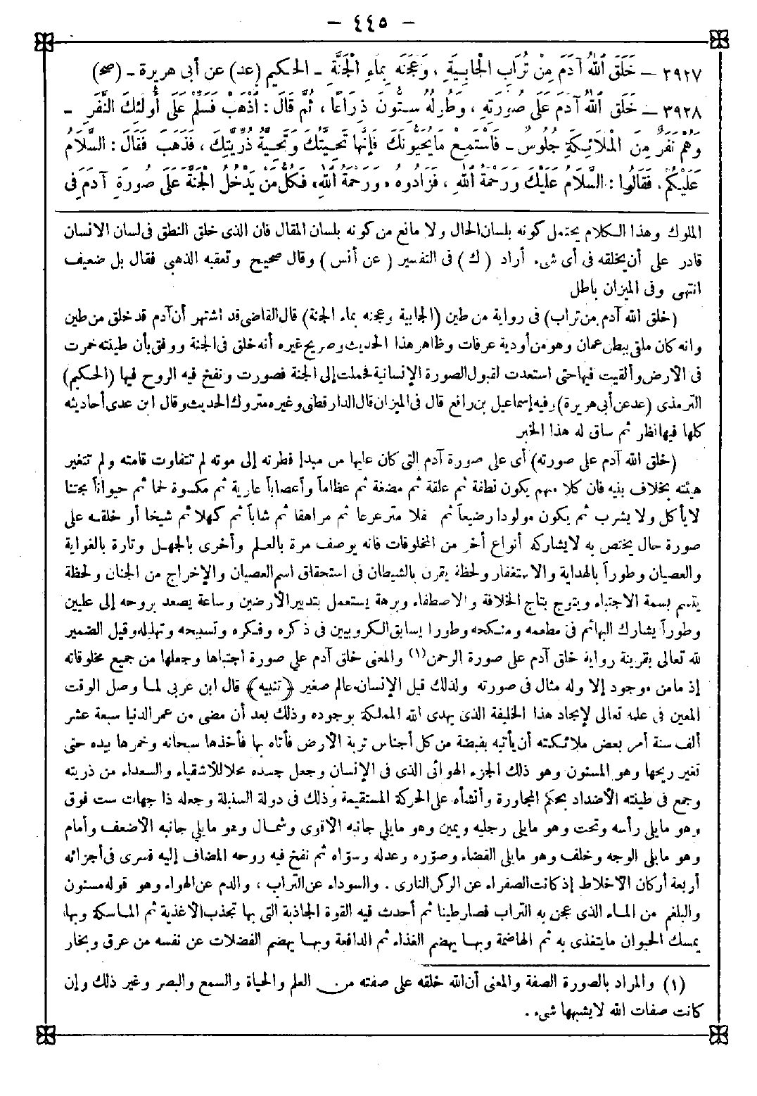 (1) والمراد بالصورة الصفة والمعنى أن الله خلقه على صفته من العلم والحياة والسمع والبصر وغير ذلك وإن كانت صفات الله لا يشبهها شيء