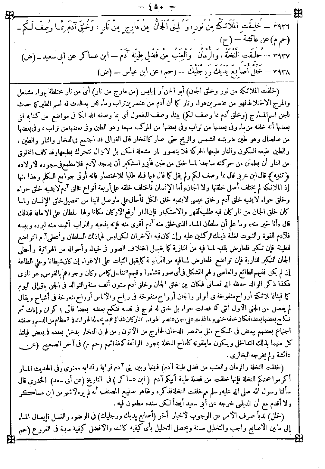 -[450]- 3936 - (خلقت الملائكة من نور وخلق الجان) أبو الجن أو إبليس (من مارج من نار) أي من نار مختلطة بهواء مشتعل والمرج الاختلاط فهو من عنصرين هواء ونار كما أن آدم من عنصرين تراب وماء عجن به فحدث له اسم الطين كما حدث للجن اسم المارج (وخلق آدم مما وصف لكم) ببناء وصف للمفعول أي بما وصفه الله لكم في مواضع من كتابه ففي بعضها أنه خلقه من ماء وفي بعضها من تراب وفي بعضها من المركب منهما وهو الطين وفي بعضها من تراب وفي بعضها من صلصال وهو طين ضربته الشمس والريح حتى صار كالفخار قال الغزالي: قد اجتمع في الفخار والنار والطين والطين طبعه السكون والنار طبعها الحركة فلا يتصور نار مشعلة تسكن بل لا تزال تتحرك بطبعها وقد كلف المخلوق من النار أن يطمئن من حركته ساجدا لما خلق من طين فأبى واستكبر أن يسجد لآدم فلا مطمع في سجوده لأولاده <تنبيه> قال ابن عربي: قال مما وصف لكم ولم يقل كما قال فيما قبله طلبا للاختصار فإنه أوتي جوامع الكلم وهذا منها إذ الملائكة لم يختلف أصل خلقتها ولا الجان وأما الإنسان فاختلف خلقه على أربعة أنواع فخلق آدم لا يشبه خلق حواء وخلق حواء لا يشبه خلق آدم وخلق عيسى لا يشبه خلق الكل فأحال على ما وصل إلينا من تفصيل خلق الإنسان ولما كان خلق الجان من نار كان فيه طلب القهر والاستكبار فإن النار أرفع الأركان مكانا ولها سلطان على الإحالة فلذلك قال {أنا خير منه} وما علم أن سلطان الماء الذي خلق منه آدم أقوى منه فإنه يذهبه والتراب أثبت منه ليرده ويبسه فلآدم القوة والثبوت لغلبة دينك الركنين عليه وإن كان فيه الآخران لكن ليس لهما ذلك السلطان وأعطى آدم التواضع للطينة فإن تكبر فلعارض بقلبه لما فيه من النارية كما يقبل اختلاف الصور في خياله وأحواله من الهوائية وأعطى الجان التكبر للنارية فإن تواضع فلعارض لما فيه من الترابية كما يقبل الثبات على الإغواء إن كان شيطانا وعلى الطاعة إن لم يكن ففيهم الطائع والعاصي ولهم التشكل في أي صورة شاؤوا وفيهم التناسل كما مر وكان وجودهم بالقوس وهو ناري هكذا ذكر الوالد حفظه الله تعالى فكان بين خلق الجان وخلق آدم ستون ألف سنة والتوالد في الجن باق إلى اليوم كما فينا فالملائكة أرواح منفوخة في أنوار والجان أرواح منفوخة في رياح والأناس أرواح منفوخة في أشباح ويقال لم يفصل عن الجني الأول أنثى كما فصلت حواء بل خلق له فرج في نفسه فنكح بعضه بعضا فأتى بذكران وإناث ثم نكح بعضها بعضا فكان خلقه خنثى ولما غلبت على الجن عنصر الهواء والنار كان غذاؤهم ما يحمله له الهواء مما في العظام من الدسم وصفته اجتماع بعضهم ببعض في النكاح مثل ما تبصر الدخان الخارج من الأتون ومن فرن الفخار يدخل بعضه في بعض فيلتذ كل منهما بذلك التداخل ويكون ما يلقونه كلقاح النخلة بمجرد الرائحة كغذائهم