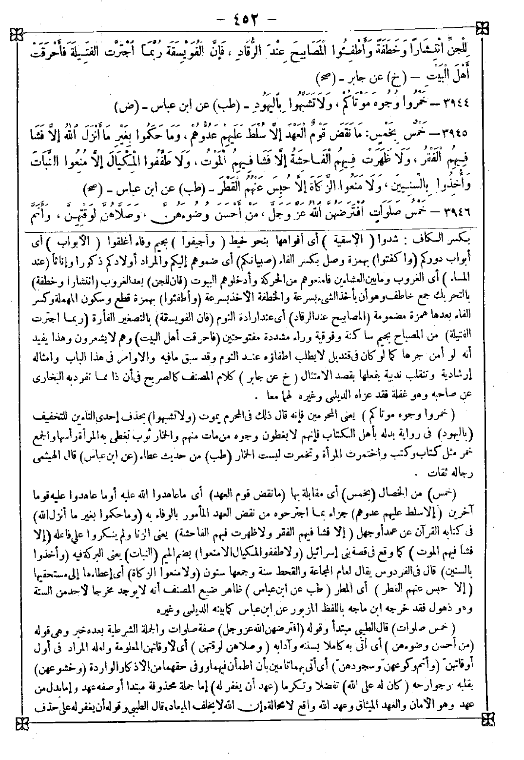 3945 - (خمس) من الخصال (بخمس) أي مقابلة بها (ما نقض قوم العهد) أي ما عاهدوا الله عليه أو ما عاهدوا عليه قوما آخرين (إلا سلط عليهم عدوهم) جزاء بما اجترحوه من نقض العهد المأمور بالوفاء به (وما حكموا بغير ما أنزل الله) في كتابه القرآن عن عمد أو جهل (إلا فشا فيهم الفقر ولا ظهرت فيهم الفاحشة) يعني الزنا ولم ينكروا على فاعله (إلا فشا فيهم الموت) كما وقع في قصة بني إسرائيل (ولا طففوا المكيال إلا منعوا) بضم الميم (النبات) يعني البركة فيه (وأخذوا بالسنين) قال في الفردوس: يقال لعام المجاعة والقحط سنة وجمعها سنون (ولا منعوا الزكاة) أي إعطاءها إلى مستحقيها (إلا حبس عنهم الفطر) أي المطر