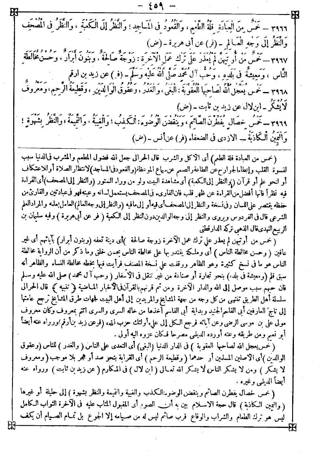 -[459]- 3966 - (خمس من العبادة قلة الطعم) أي الأكل والشرب قال الحرالي: جعل الله فضول المطعم والمشرب في الدنيا سبب لقسوة القلب وإبطاء الجوارح عن الطاعة والصمم عن سماع الموعظة (والعقود في المساجد) لانتظار الصلاة أو للاعتكاف أو لنحو علم أو قرآن (والنظر إلى الكعبة) أي مشاهدة البيت ولو من وراء الستور (والنظر إلى المصحف) أي القراءة فيه نظرا فإنها أفضل من القراءة من ظهر قلب فإن القارئ في المصحف يستعمل لسانه وعينه فهو في عبادتين والقارئ من حفظه يقتصر على اللسان وفي نسخة النظر إلى المصحف أي فيه أو إلى ما فيه (والنظر إلى وجه العالم) العامل بعلمه والمراد العلم الشرعي قال في الفردوس: ويروى النظر إلى وجه الوالدين دون النظر إلى الكعبة