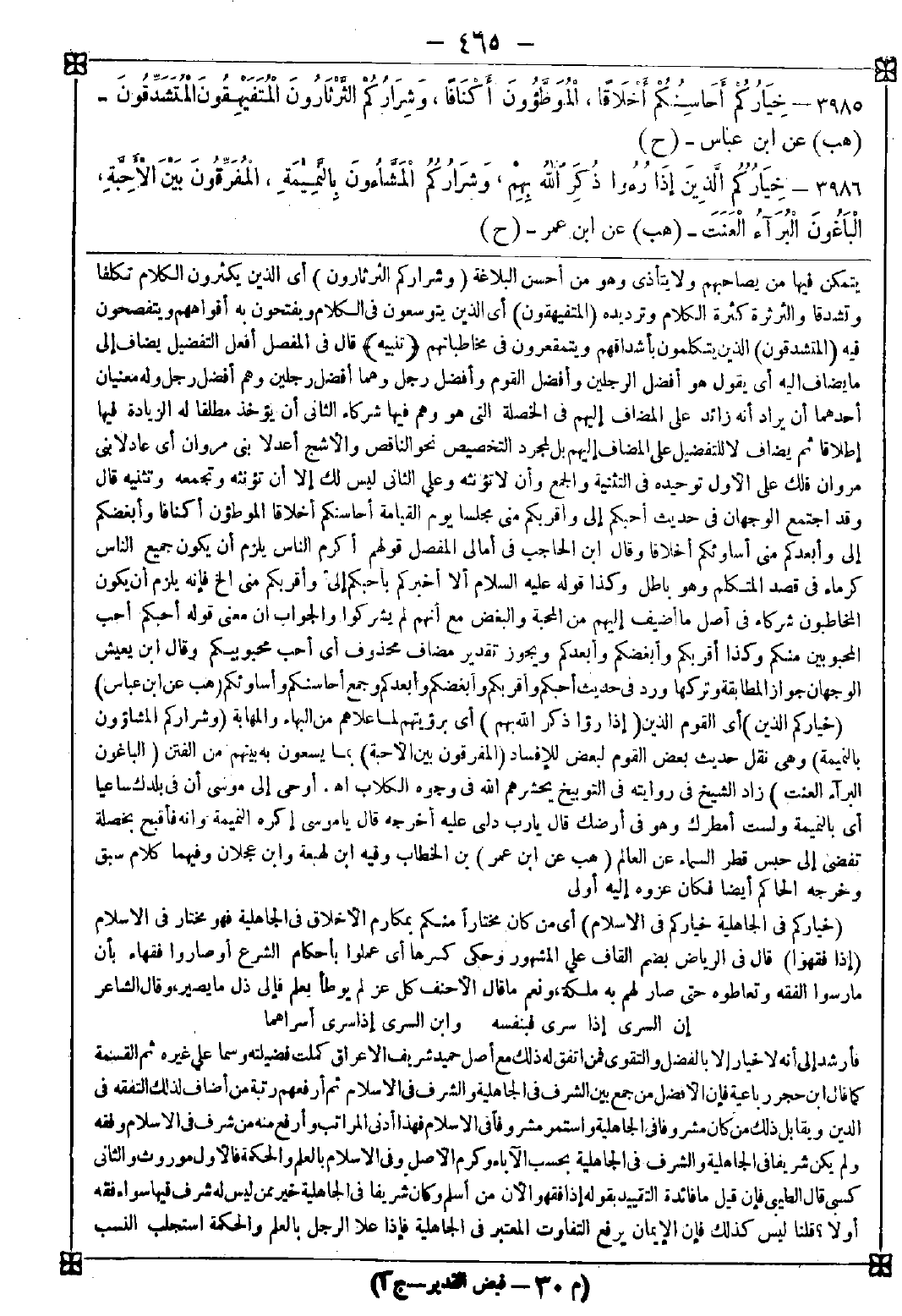 3986 - (خياركم الذين) أي القوم الذين (إذا رؤوا ذكر الله بهم) أي برؤيتهم لما علاهم من البهاء والمهابة (وشراركم المشاؤون بالنميمة) وهي نقل حديث بعض القوم لبعض للإفساد (المفرقون بين الأحبة) بما يسعون به بينهم من الفتن (الباغون البراء العنت) زاد الشيخ في روايته في التوبيخ يحشرهم الله في وجوه الكلاب اه. أوحي إلى موسى أن في بلدك ساعيا أي بالنميمة ولست أمطرك وهو في أرضك قال: يا رب دلني عليه أخرجه قال: يا موسى اكره النميمة وانه فأقبح بخصلة تفضي إلى حبس قطر السماء عن العالم