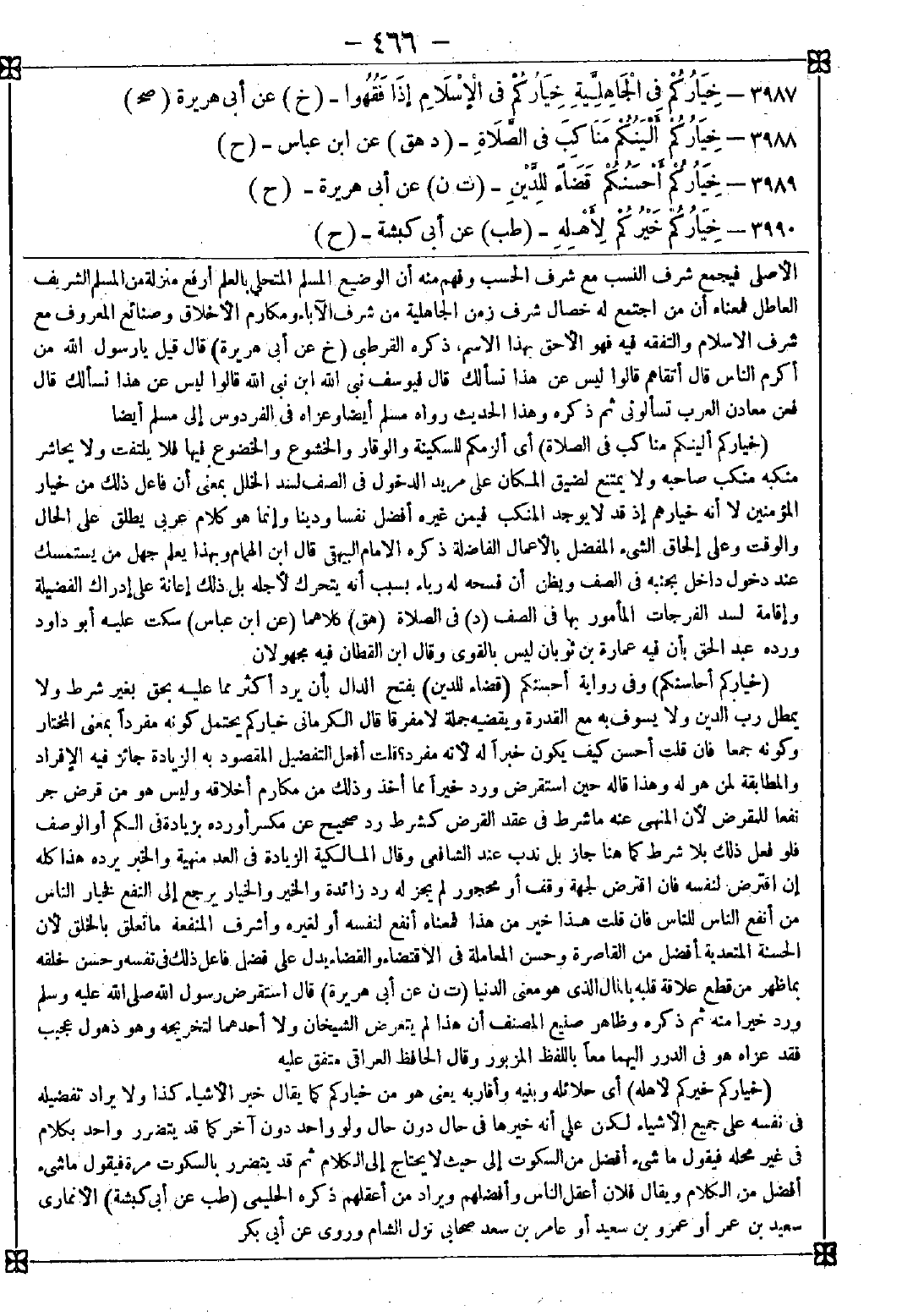3989 - (خياركم أحاسنكم) وفي رواية أحسنكم (قضاء للدين) بفتح الدال بأن يرد أكثر مما عليه بحق بغير شرط ولا يمطل رب الدين ولا يسوف به مع القدرة ويقضيه جملة لا مفرقا قال الكرماني: خياركم يحتمل كونه مفردا بمعنى المختار وكونه جمعا فإن قلت: أحسن كيف يكون خبرا له لأنه مفرد؟ قلت: أفعل التفضيل المقصود به الزيادة جائز فيه الإفراد والمطابقة لمن هو له وهذا قاله حين استقرض ورد خيرا مما أخذ وذلك من مكارم أخلاقه وليس هو من قرض جر نفعا للمقرض لأن المنهى عنه ما شرط في عقد القرض كشرط رد صحيح عن مكسر أو رده بزيادة في الكم أو الوصف فلو فعل ذلك بلا شرط كما هنا جاز بل ندب عند الشافعي وقال المالكية: الزيادة في العد منهية والخبر يرده هذا كله إن اقترض لنفسه فإن اقترض لجهة وقف أو محجور لم يجز له رد زائدة والخير والخيار يرجع إلى النفع فخيار الناس من أنفع الناس للناس فإن قلت: هذا خير من هذا فمعناه أنفع لنفسه أو لغيره وأشرف المنفعة ما تعلق بالخلق لأن الحسنة المتعدية أفضل من القاصرة وحسن المعاملة في الاقتضاء والقضاء يدل على فضل فاعل ذلك في نفسه وحسن خلقه بما ظهر من قطع علاقة قلبه بالمال الذي هو معنى الدنيا