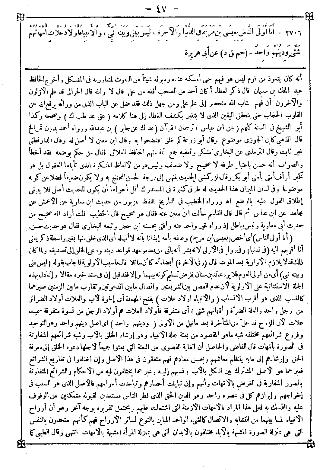 2706 - (أنا أولى الناس) أي أخص (بعيسى ابن مريم) وصفه بأمه إيذانا بأنه لا أب له أي الذي خلق منها بغير واسطة ذكر يعني أنا أقربهم إليه (في الدنيا) وفي رواية في الأولى لأنه بشر أنه يأتي من بعده ومهد قواعد دينه ودعى الخلق إلى تصديقه ولما كان ذلك قد لا يلازم الأولوية بعد الموت قال (وفي الآخرة) أيضا ثم كأن سائلا قال: ما سبب الأولوية فأجاب بقوله (ليس بيني وبينه نبي) أي من أولي العزم فلا يرد خالد بن سنان بفرض تسليم كونه بينهما وإلا فقد قيل إن في سند خبره مقالا وإنما دل بهذه الجملة الاستثنائية على الأولوية لأن عدم الفصل بين الشريعتين واتصال ما بين الدعوتين وتقارب ما بين الزمنين صيرهما كالنسب الذي هو أقرب الأنساب (والأنبياء أولاد علات) بفتح المهملة أي أخوة لأب والعلات أولاد الضرائر من رجل واحد والعلة الضرة (أمهاتهم شتى) أي متفرقة فأولاد العلات هم أولاد الرجل من نسوة متفرقة سميت علات لأن الزوج قد عل من المتأخرة بعد ما نهل من الأولى (ودينهم واحد) أي أصل دينهم واحد وهو التوحيد وفروع شرائعهم مختلفة شبه ما هو المقصود من بعثة جملة الأنبياء وهو إرشاد الخلق بالأب وشبه شرائعهم المتفاوتة في الصورة بأمهات. قال القاضي: والحاصل أن الغاية القصوى من البعثة التي بعثوا جميعا لأجلها دعوة الخلق إلى معرفة الحق وإرشادهم إلى ما به ينتظم معاشهم ويحسن معادهم فهم متفقون في هذا الأصل وإن اختلفوا في تفاريع الشرائع فعبر عما هو الأصل المشترك بين الكل بالأب ونسبهم إليه وعبر عما يختلفون فيه من الأحكام والشرائع المتفاوتة بالصور المتقاربة في الغرض بالأمهات وأنهم وإن تباينت أعصارهم وتباعدت أعوامهم فالأصل الذي هو السبب في إخراجهم وإبرازهم كل في عصره واحد وهو الدين الحق الذي فطر الناس مستعدين لقبوله متمكنين من الوقوف عليه والتمسك به فعلى هذا المراد بالأمهات الأزمنة التي اشتملت عليهم ويحتمل تقريره بوجه آخر وهو أن أرواح الأنبياء لما بينهما من التشابه والاتصال كالشيء الواحد المباين بالنوع لسائر الأرواح فهم كأنهم متحدون بالنفس التي هي بمنزلة الصورة المشبهة بالآباء مختلفون بالأبدان التي هي بمنزلة المرأة المشبهة بالأمهات انتهى. وقال الطيبي: كما -[48]- يحتمل أن يراد بالأولى والآخرة الدنيا والقيامة ويحتمل أن يراد بهما الحالة الأولى وهي كونه مبشرا والحالة الآخرة وهي كونه ناصرا مقويا لدين المصطفى صلى الله عليه وسلم ولا تعارض بين هذا وبين آية {إن أولى الناس بإبراهيم للذين اتبعوه وهذا النبي} أي أنا أخصهم به لأن الحديث وارد في كونه عليه الصلاة والسلام متبوعا والتنزيل في كونه تابعا وله الفضل تابعا ومتبوعا فإن قيل: أي تعلق لهذا بأمهات الأنبياء فالجواب: أنه تنبيه على فضل أمه. قال الزمخشري: وعيسى بالسريانية أيسوع ومريم بمعنى الخادم وقيل مريم بالعربية من النساء كالزين من الرجال ووزن مريم عند النحاة مفعل لأن فعيلا بفتح الفاء لم يثبت في الأبنية وفيه إبطال لزعم أنه كان بعد عيسى عليه الصلاة والسلام أنبياء ورسل منهم خالد بن سنان