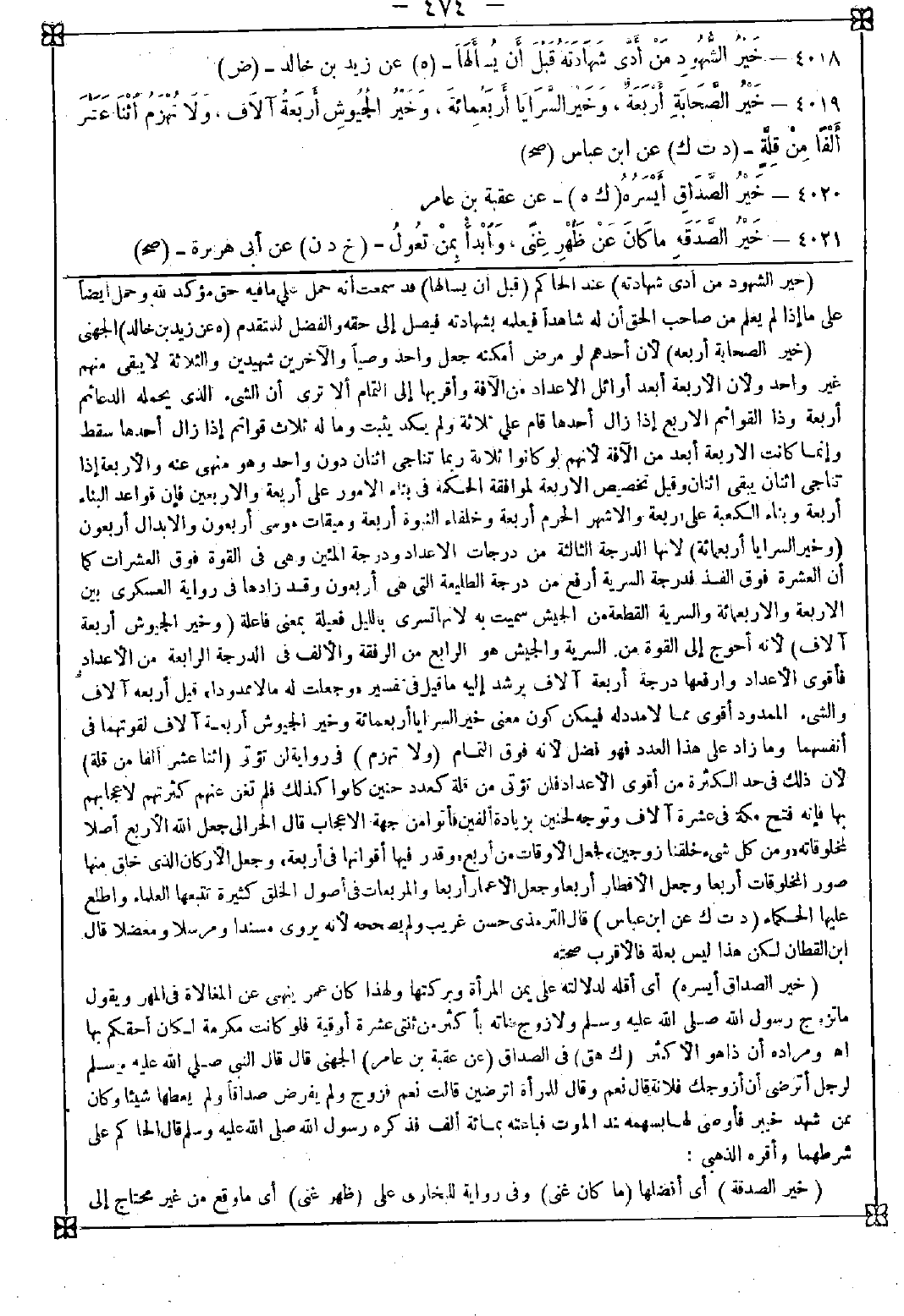 -[474]- 4018 - (خير الشهود من أدى شهادته) عند الحاكم (قبل أن يسألها) قد سمعت أنه حمل على ما فيه حق مؤكد لله وحمل أيضا على ما إذا لم يعلم من صاحب الحق أن له شاهدا فيعلمه بشهادته فيصل إلى حقه والفضل للمتقدم