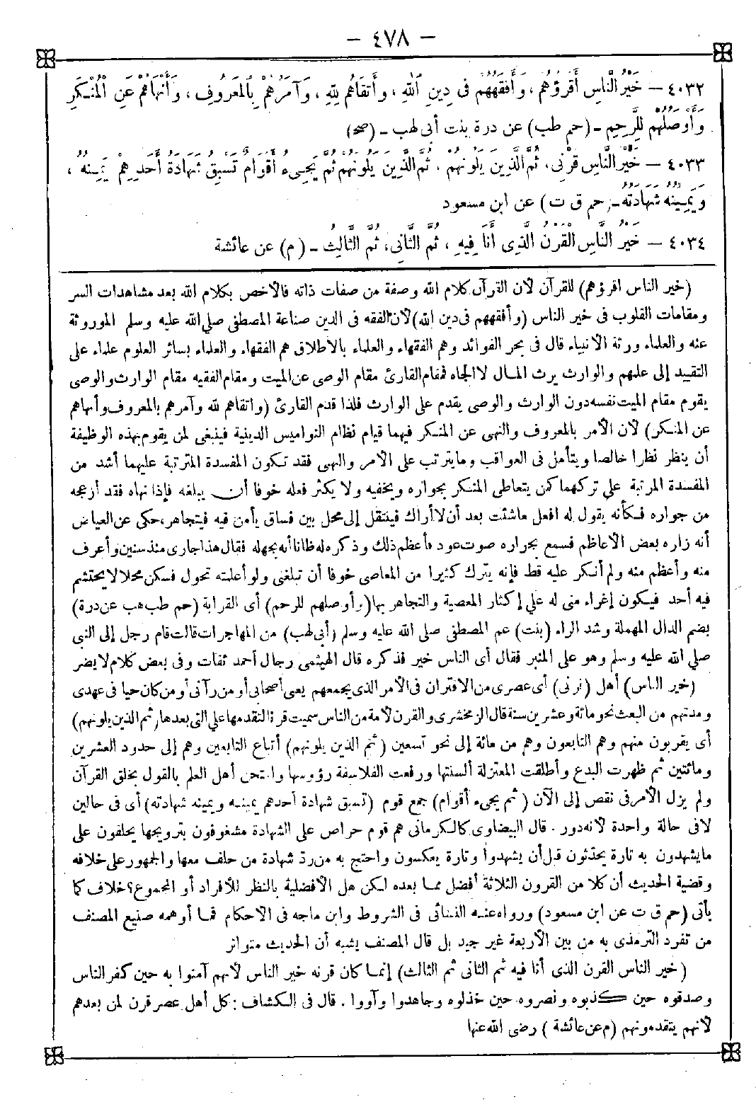 4034 - (خير الناس القرن الذي أنا فيه ثم الثاني ثم الثالث) إنما كان قرنه خير الناس لأنهم آمنوا به حين كفر الناس وصدقوه حين كذبوه ونصروه حين خذلوه وجاهدوا وآووا. قال الكشاف: كل أهل عصر قرن لمن بعدهم لأنهم يتقدمونهم