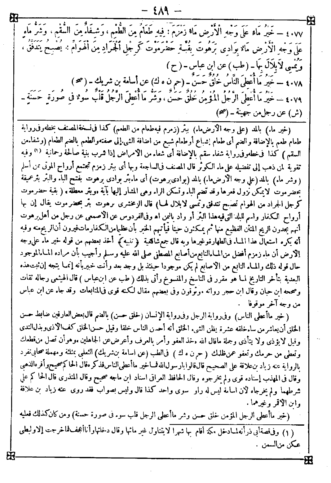 -[489]- 4077 - (خير ماء) بالمد (على وجه الأرض ماء) ببئر (زمزم فيه طعام من الطعم) كذا في نسخة المصنف بخطه وفي رواية طعام طعم بالإضافة والضم أي طعام إشباع أو طعام شبع من إضافة الشيء إلى صفته والطعم بالضم الطعام (وشفاء من السقم) كذا في خطه وفي رواية شفاء سقم بالإضافة أي شفاء من الأمراض إذا شرب بنية صالحة رحمنية (1) وفيه تقوية لمن ذهب إلى تفضيله على ماء الكوثر قال المصنف في الساجعة: وبها أي ببئر زمزم تجتمع أرواح الموتى ممن أسلم (وشر ماء) بالمد (على وجه الأرض ماء) بالمد (بوادي برهوت) أي ماء بئر بوادي برهوت بفتح الباء والبئر بئر عميقة بحضرموت لا يمكن نزول قعرها وقد تضم الباء وتسكن الراء وهي المشار إليها بآية {وبئر معطلة} (بقية حضرموت كرجل الجراد من الهوام تصبح تتدفق وتمسي لا بلال لها) قال الزمخشري: برهوت بئر بحضرموت يقال إن بها أرواح الكفار واسم للبلد التي فيها هذا البئر أو واد باليمن اه في الفردوس عن الأصمعي عن رجل من أهل برهوت أنهم يجدون الريح المنتن الفظيع منها ثم يمكثون حينا فيأتيهم الخبر بأن عظيما من الكفار مات فيرون أن الريح منه وفيه أنه يكره استعمال هذا الماء في الطهارة وغيرها وبه قال جمع شافعية <تنبيه> أخذ بعضهم من قوله خير ماء على وجه الأرض أن ماء زمزم أفضل من الماء النابع من أصابع المصطفى صلى الله عليه وسلم وأجيب بأن مراده الماء الموجود حال قوله ذلك والماء النابع من الأصابع لم يكن موجودا حينئذ بل وجد بعد وأنت خبير بأنه إنما يتجه إن ثبتت هذه البعدية بتأخر التاريخ لما هو مقرر في الناسخ والمنسوخ وأتى بذلك