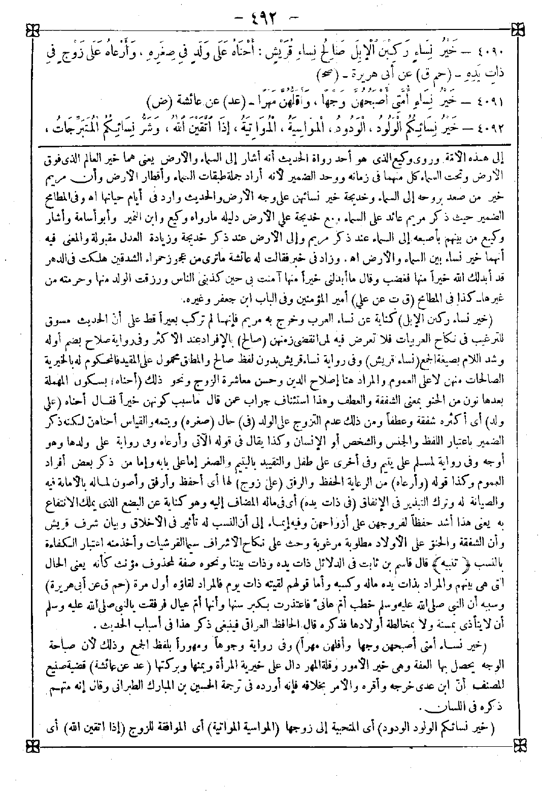 4090 - (خير نساء ركبن الإبل) كناية عن نساء العرب وخرج به مريم فإنها لم تركب بعيرا قط على أن الحديث مسوق للترغيب في نكاح العربيات فلا تعرض فيه لمن انقضى زمنهن (صالح) بالإفراد عند الأكثر وفي رواية صلاح بضم أوله وشد اللام بصيغة الجمع (نساء العالمين) وفي رواية نساء قريش بدون لفظ صالح والمطلق محمول على المقيد فالمحكوم له بالخيرية الصالحات منهن لا على العموم والمراد هنا إصلاح الدين وحسن معاشرة الزوج ونحو ذلك (أحناه) بسكون المهملة بعدها نون من الحنو بمعنى الشفقة والعطف وهذا استئناف جواب عمن قال: ما سبب كونهن خيرا فقال: أحناه (على ولد) أي أكثره شفقة وعطفا ومن ذلك عدم التزوج على الولد (في) حال (صغره) ويتمه والقياس أحناهن لكنه ذكر الضمير باعتبار اللفظ والجنس والشخص أو الإنسان وكذا يقال في قوله الآتي وأرعاه وفي رواية على ولدها وهو أوجه وفي رواية لمسلم على يتيم وفي أخرى على طفل والتقييد باليتيم والصغر إما على بابه وإما من ذكر بعض أفراد العموم وكذا قوله (وأرعاه) من الرعاية الحفظ والرفق (على زوج) لها أي أحفظ وأرفق وأصون لماله بالأمانة فيه والصيانة له وترك التبذير في الإنفاق (في ذات يده) أي في ماله المضاف إليه وهو كناية عن البضع الذي يملك الانتفاع به يعني هذا أشد حفظا لفروجهن على أزواجهن وفيه إيماء إلى أن النسب له تأثير في الأخلاق وبيان شرف قريش وأن الشفقة والحنو على الأولاد مطلوبة مرغوبة وحث على نكاح الأشراف سيما القرشيات وأخذ منه اعتبار الكفاءة بالنسب <تنبيه> قال قاسم بن ثابت في الدلائل ذات يده وذات بيننا ونحوه صفة لمحذوف مؤنث كأنه يعني الحال التي هي بينهم والمراد بذات يده ماله وكسبه وأما قولهم لقيته ذات يوم فالمراد لقاؤه أول مرة