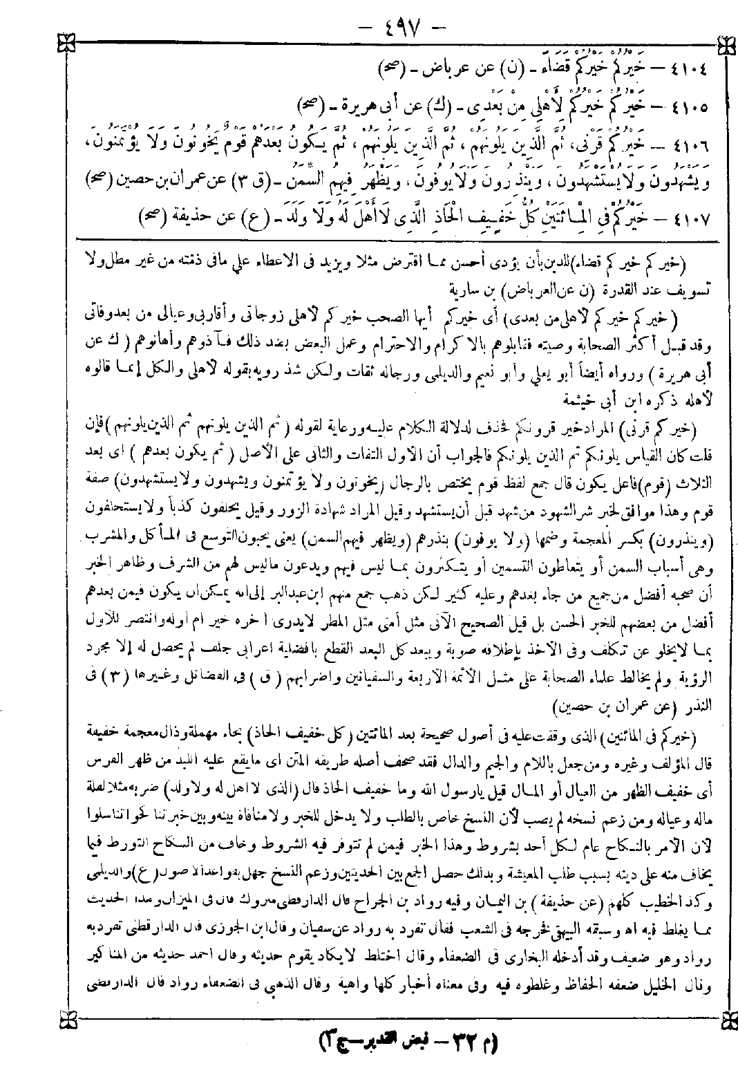 4106 - (خيركم قرني) المراد خير قرونكم فحذف لدلالة الكلام عليه ورعاية لقوله (ثم الذين يلونهم ثم الذين يلونهم) فإن قلت كان القياس يلونكم ثم الذين يلونكم فالجواب أن الأول التفات والثاني على الأصل (ثم يكون بعدهم) أي بعد الثلاث (قوم) فاعل يكون قال جمع: لفظ قوم يختص بالرجال (يخونون ولا يؤتمنون ويشهدون ولا يستشهدون) صفة قوم وهذا موافق لخبر شر الشهود من شهد قبل أن يستشهد وقيل المراد شهادة الزور وقيل يحلفون كذبا ولا يستحلفون (وينذرون) بكسر المعجمة وضمها (ولا يوفون) بنذرهم (ويظهر فيهم السمن) يعني يحبون التوسع في المأكل والمشرب وهي أسباب السمن أو يتعاطون التسمين أو يتكثرون بما ليس فيهم ويدعون ما ليس لهم من الشرف وظاهر الخبر أن صحبه أفضل من جميع من جاء بعدهم وعليه كثير لكن ذهب جمع منهم ابن عبد البر إلى أنه يمكن أن يكون فيمن بعدهم أفضل من بعضهم للخبر الحسن بل قيل الصحيح الآتي مثل أمتي مثل المطر لا يدرى آخره خير أم أوله وانتصر للأول بما لا يخلو عن تكلف وفي الأخذ بإطلاقه صوبة ويبعد كل البعد القطع بأفضلية أعرابي جلف لم يحصل له إلا مجرد الرؤية ولم يخالط علماء الصحابة على مثل الأئمة الأربعة والسفيانين وأضرابهم