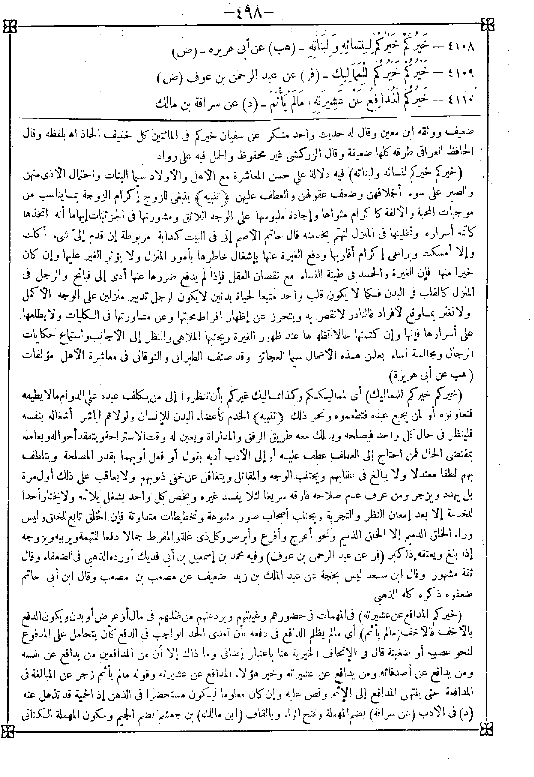 4108 - (خيركم خيركم لنسائه ولبناته) فيه دلالة على حسن المعاشرة مع الأهل والأولاد سيما البنات واحتمال الأذى منهن والصبر على سوء أخلاقهن وضعف عقولهن والعطف عليهن <تنبيه> ينبغي للزوج إكرام الزوجة بما يناسب من موجبات المحبة والألفة كإكرام مثواها وإجادة ملبوسها على الوجه اللائق ومشورتها في الجزئيات إيهاما أنه اتخذها كاتمة أسراره وتخليتها في المنزل لتهتم بخدمته قال حاتم الأصم: إني في البيت كدابة مربوطة إن قدم إلي شيء أكلت وإلا أمسكت ويراعى إكرام أقاربها ودفع الغيرة عنها بإشغال خاطرها بأمور المنزل ولا يؤثر الغير عليها وإن كان خيرا منها فإن الغيرة والحسد في طينة النساء مع نقصان العقل فإذا لم يدفع عنها أذى إلى قبائح والرجل في المنزل كالقلب في البدن فكما لا يكون قلب واحد متبعا لحياة بدنين لا يكون لرجل تدبير منزلين على الوجه الأكمل ولا تغتر بما وقع لأفراد فالنادر لا نقص به ويتحرز عن إظهار إفراط محبتها وعن مشاورتها في الكليات ولا يطلعها على أسرارها فإنها وإن كتمتها حالا تظهرها عند ظهور الغيرة ويجنبها الملاهي والنظر إلى الأجانب واستمتاع حكايات الرجال ومجالسة نساء يعلمن هذه الأعمال سيما في العجائز وقد صنف الطبراني والنوقاني في معاشرة الأهل مؤلفات