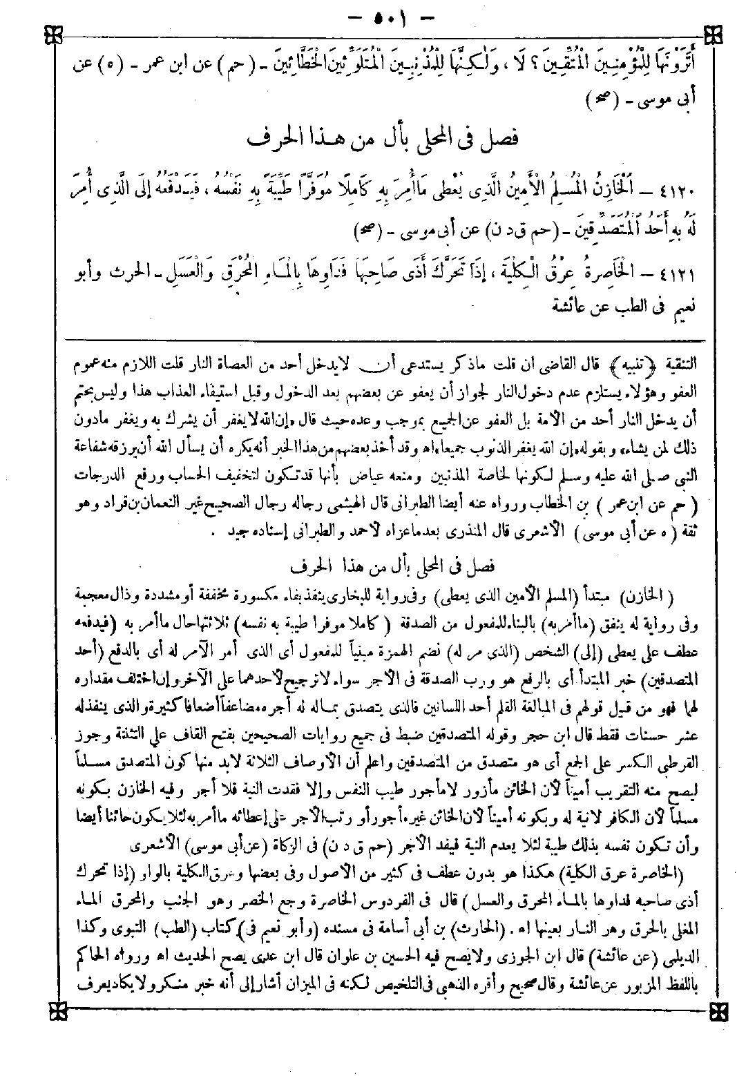 4120 - (الخازن) مبتدأ (المسلم الأمين الذي يعطي) وفي رواية للبخاري ينفذ بفاء مكسورة مخففة أو مشددة وذال معجمة وفي رواية له ينفق (ما أمر به) بالبناء للمفعول من الصدقة (كاملا موفرا طيبة به نفسه) ثلاثتها حال ما أمر به (فيدفعه) عطف على يعطي (إلى) الشخص (الذي أمر له) تضم الهمزة مبنيا للمفعول أي الذي أمر الآمر له أي بالدفع (أحد المتصدقين) خبر المبتدأ أي بالرفع هو ورب الصدقة في الأجر سواء لا ترجيح لأحدهما على الآخر وإن اختلف مقداره لهما فهو من قبيل قولهم في المبالغة القلم أحد اللسانين فالذي يتصدق بماله له أجره مضاعفا أضعافا كثيرة والذي ينفذ له عشر حسنات فقط قال ابن حجر: وقوله المتصدقين ضبط في جميع روايات الصحيحين بفتح القاف على التثنية وجوز القرطبي الكسر على الجمع أي هو متصدق من المتصدقين واعلم أن الأوصاف الثلاثة لا بد منها كون المتصدق مسلما ليصح منه التقريب أمينا لأن الخائن مأزور لا مأجور طيب النفس وإلا فقدت النية فلا أجر وفيه الخازن بكونه مسلما لأن الكافر لا نية له وبكونه أمنيا لأن الخائن غير مأجور أو رتب الأجر على إعطائه ما أمر به لئلا يكون خائنا أيضا وأن تكون نفسه بذلك طيبة لئلا يعدم النية فيفد الأجر
