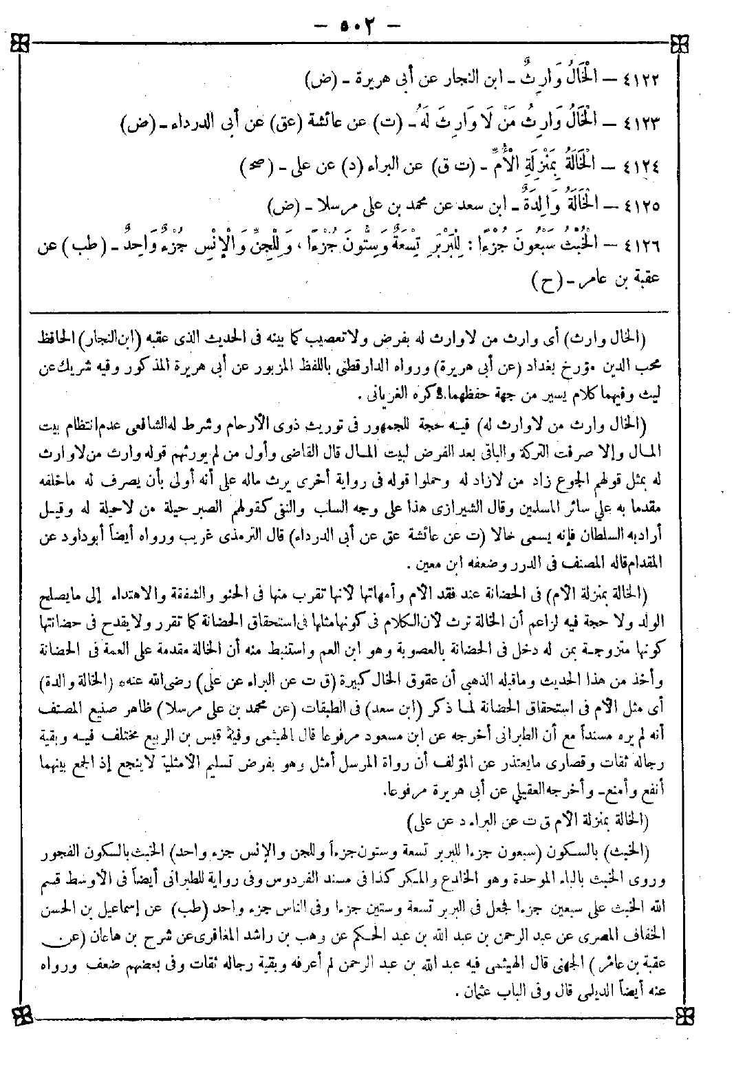 -[502]- 4122 - (الخال وارث) أي وارث من لا وارث له بفرض ولا تعصيب كما في الحديث الذي عقبه