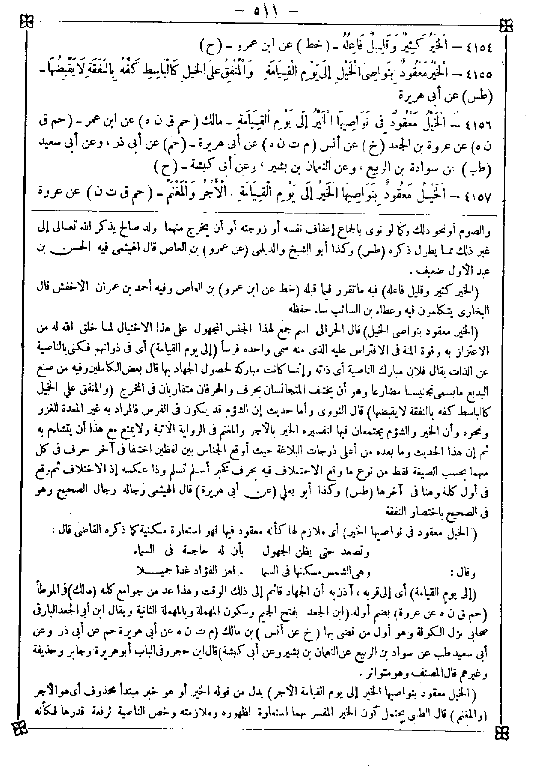 4156 - (الخيل معقود في نواصيها الخير) أي ملازم لها كأنه معقود فيها فهو استعارة مكنية كما ذكره القاضي قال: