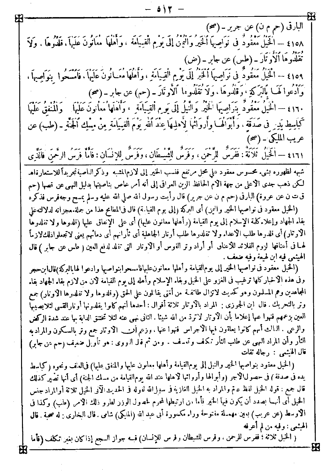 4158 - (الخيل معقود في نواصيها الخير واليمن) أي البركة (إلى يوم القيامة) قال في المطامح: هذا من جملة معجزاته لدلالته على بقاء الجهاد وإعلاء كلمة الإسلام إلى يوم القيامة (وأهلها معانون عليها) أي على الإنفاق عليها (قلدوها ولا تقلدوها الأوتار) أي قلدوها طلب الأعداء ولا تقلدوها طلب أوتار الجاهلية أي ثأرانهم أي دمائهم يعني لا تجعلوا ذلك لازما لها في أعناقها لزوم القلائد للأعناق أو أراد وتر القوس أو الأوتار التي تقلد لدفع العين