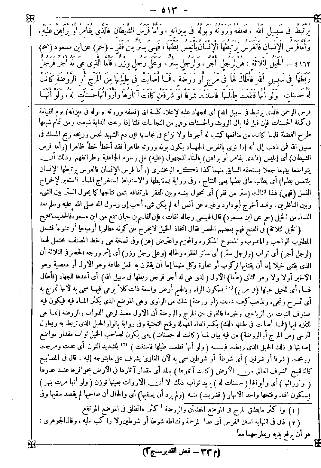 4162 - (الخيل لثلاثة) في الفتح فهم بعضهم الحصر فقال: اتخاذ الخيل لا يخرج عن كونه مطلوبا أو مباحا أو ممنوعا فشمل المطلوب الواجب والمندوب والممنوع المكروه والمحرم واعترض (هن) وفي نسخة هي وخط المصنف محتمل لهما (لرجل أجر) أي ثواب (ولرجل ستر) أي ساتر لفقره ولحاله (وعلى رجل وزر) أي إثم ووجه الحصر في الثلاثة أن الذي يقتني خيلا إما أن يقتنيها لركوب أو تجارة وكل منهما إما أن يقترن به فعل طاعة وهو الأول أو معصية وهو الأخير أو لا ولا وهو الثاني (فأما) الأول (الذي هي له أجر فرجل ربطها في سبيل الله) أي أعدها للجهاد (فأطال لها) أي للخيل حبلها (في مرج) (1) بسكون الراء وبالجيم أرض واسعة ذات كلأ يرعى فيها سمي به لأنها تمرح به أي تسرح وتجيء وتذهب كيف شاءت (أو روضة) شك من الراوي وهي الموضع الذي يكثر الماء فيه فيكون فيه صنوف النبات من الرياحين وغيرها فالفرق بين المرج والروضة أن الأول معد لرعي الدواب والروضة إنما هي للتنزه فيها (فما أصابت في طيلها ذلك) بكسر الطاء المهملة وفتح التحتية وفي رواية بالواو الحبل الذي تربط به ويطول لترعى (من المرج أو الروضة) من فيه بيان لما (كانت له حسنات) يعني يكون لصاحب الخيل ثواب مقدار مواضع إصابتها في ذلك الحبل الذي ربطت فيه (ولو أنها قطعت طيلها فاستنت) (2) بتشديد النون أي عدت ومرجت ورمحت (شرفا أو شرفين) أي شوطا أو شوطين سمي به لأن الغازي يشرف على ما يتوجه إليه. قال في المصابيح كالتنقيح: الشرف العالي من الأرض (كانت آثارها) بالمد أي مقدار آثارها في الأرض بحوافرها عند عدوها (وأرواثها) أي وأبوالها (حسنات له) يريد ذلك لا أن الأرواث بعينها توزن (ولو أنها مرت بنهر) بسكون الهاء وفتحها واحد الأنهار (فشربت) منه (ولم يرد أن يسقيها) أي والحال أن صاحبها لم يقصد سقيها وفي -[514]- رواية ولم يرد أن يسقي بحذف ضمير المفعول (فإن ذلك) أي ما شربته يعني قدره وإرادته أن يسقيها (حسنات له) وإذا حصل له هذا الثواب حيث لم يقصد سقيها ففي قصده أولى فهو من التنبيه بالأدنى على الأعلى (و) الثاني الذي هي له ستر (رجل ربطها تغنيا) بفتح المثناة والمعجمة أي استغناء عن الناس يطلب نتاجها (وسترا) من الفقر (وتعففا) عن سؤال الناس عند الحاجة ببيع نتاجها أو بما يحصل من أجرتها أومن الاتجار فيها أو بما يتردد عليها في مزارعة ومتاجرة ومعاملة (ثم لم ينس حق الله) المفروض (في رقابها) بالإحسان إليها والقيام بعلفها والشفقة عليها في الركوب وخص الرقاب لاستعارتها كثيرا في الحقوق اللازمة (و) لا في (ظهورها) بأن يحمل عليها الغازي المنقطع ويعير الفحل لمن طلب منه إعارته للطروق أو بأن لا يحملها ما لا تطيقه ونحو ذلك وعلى هذا التقدير فلا حجة فيه للحنفية في إيجاب الزكاة فيها لأن الدليل إذا طرق إليه الاحتمال سقط به الاستدلال (فهي له) أي لصاحبها (سترا) أي ساتر من المسكنة (و) الثالث التي هي وزر (رجل ربطها فخرا) نصب للتعليل أي لأجل الفخر أي تعاظما (ورياء) إظهارا للطاعة والباطن بخلافه (ونواء) بكسر النون والمد أي مناوأة ومعاداة (لأهل الإسلام) كقوله ناوأت العدو مناوأة والمراد العداوة والواو بمعنى أو فكل واحد مذموم وحده وفيه بيان فضل الخيل وأنها إنما يكون في نواصيها الخير إذا كانت لطاعة أو مباح وإلا (فهي له وزر) أي إثم قيل علة كونها وزرا مجموع هذه الأوصاف الثلاثة لأن الفخر لأهل العلم والرؤساء ليس بموجب للوزر كذا قيل وفيه تكلف ظاهر والظاهر أن لكل واحد موجب
