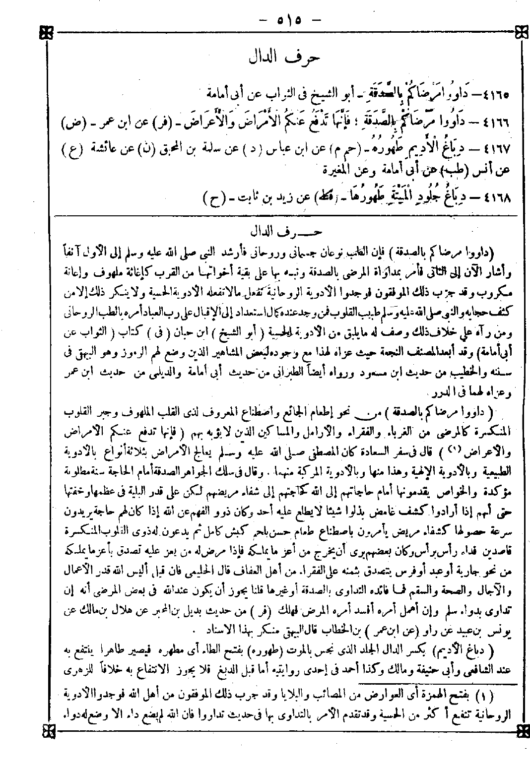 4165 - (داووا مرضاكم بالصدقة) فإن الطب نوعان جسماني وروحاني فأرشد النبي صلى الله عليه وسلم إلى الأول آنفا وأشار الآن إلى الثاني فأمر بمداواة المرضى بالصدقة ونبه بها على بقية أخواتها من القرب كإغاثة ملهوف وإغاثة مكروب وقد جرب ذلك الموفقون فوجدوا الأدوية الروحانية تفعل ما لا تفعله الأدوية الحسية ولا ينكر ذلك إلا من كشف حجابه والنبي صلى الله عليه وسلم طبيب القلوب فمن وجد عنده كمال استعداد إلى الإقبال على رب العباد أمره بالطب الروحاني ومن رآه على خلاف ذلك وصف له ما يليق من الأدوية الحسية