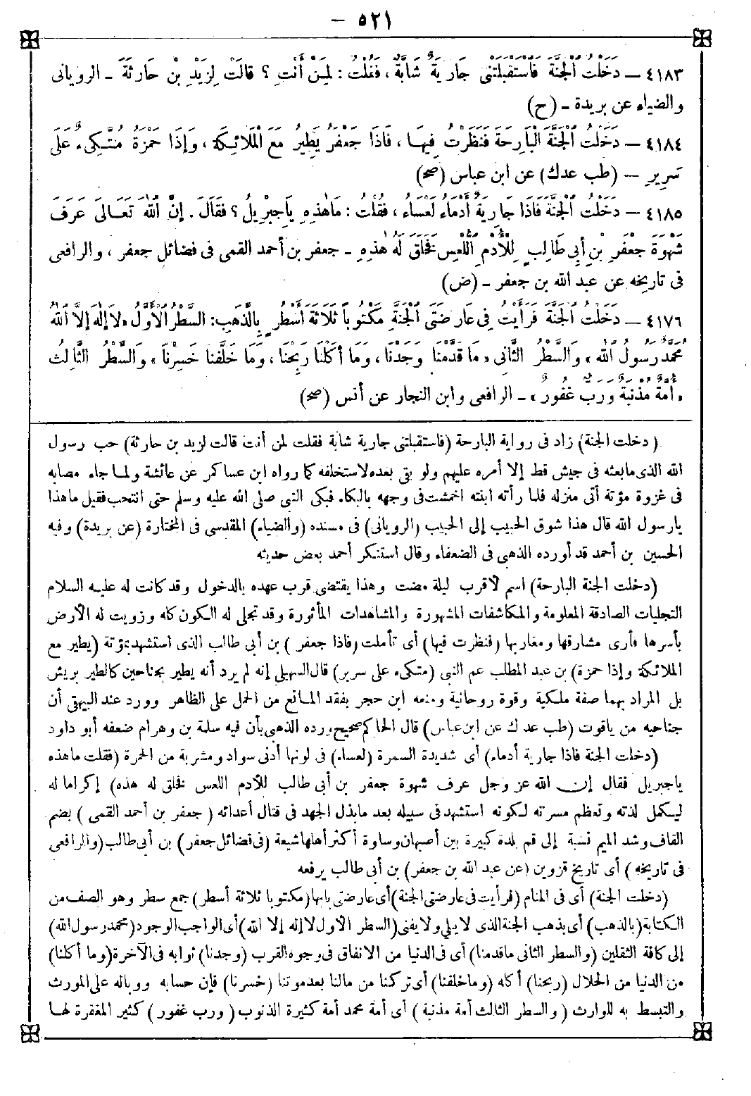 4184 - (دخلت الجنة البارحة) اسم لأقرب ليلة مضت وهذا يقتضي قرب عهده بالدخول وقد كانت له عليه السلام التجليات الصادقة المعلومة والمكاشفات المشهورة والمشاهدات المأثورة وقد تجلى له الكون كله وزويت له الأرض بأسرها فأري مشارقها ومغاربها (فنظرت فيها) أي تأملت (فإذا جعفر) بن أبي طالب الذي استشهد بمؤتة (يطير مع الملائكة وإذا حمزة) بن عبد المطلب عم النبي (متكئ على سرير) قال السهيلي: إنه لم يرد أنه يطير بجناحين كالطير بريش بل المراد بهما صفة ملكية وقوة روحانية ومنعه ابن حجر بفقد المانع من الحمل على الظاهر وورد عند البيهقي أن جناحيه من ياقوت