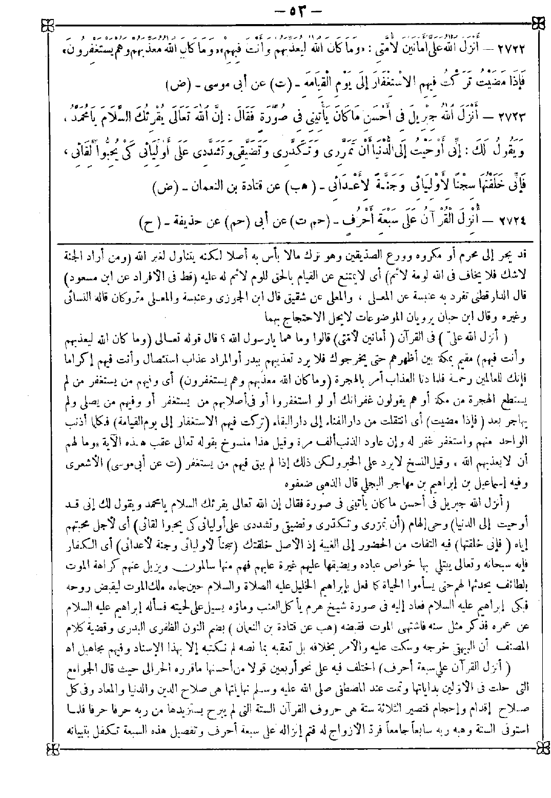 2724 - (أنزل القرآن على سبعة أحرف) اختلف فيه على نحو أربعين قولا من أحسنها ما قرره الحرالي حيث قال: الجوامع التي حلت في الأولين بداياتها وتمت عند المصطفى صلى الله عليه وسلم نهاياتها هي صلاح الدين والدنيا والمعاد وفي كل صلاح إقدام وإحجام فتصير الثلاثة ستة هي حروف القرآن الستة التي لم يبرح يستزيدها من ربه حرفا حرفا فلما استوفى الستة وهبه ربه سابعا جامعا فرد الأزواج له فتم إنزاله على سبعة أحرف وتفصيل هذه السبعة تكفل بتبيانه -[54]- الحديث الآتي بعده بخمسة أحاديث المغني عن طلبتها بالحدس والتأويل المبطل لشعب تلك الأقاويل وفي بيانه شفاء العي وثلج اليقين