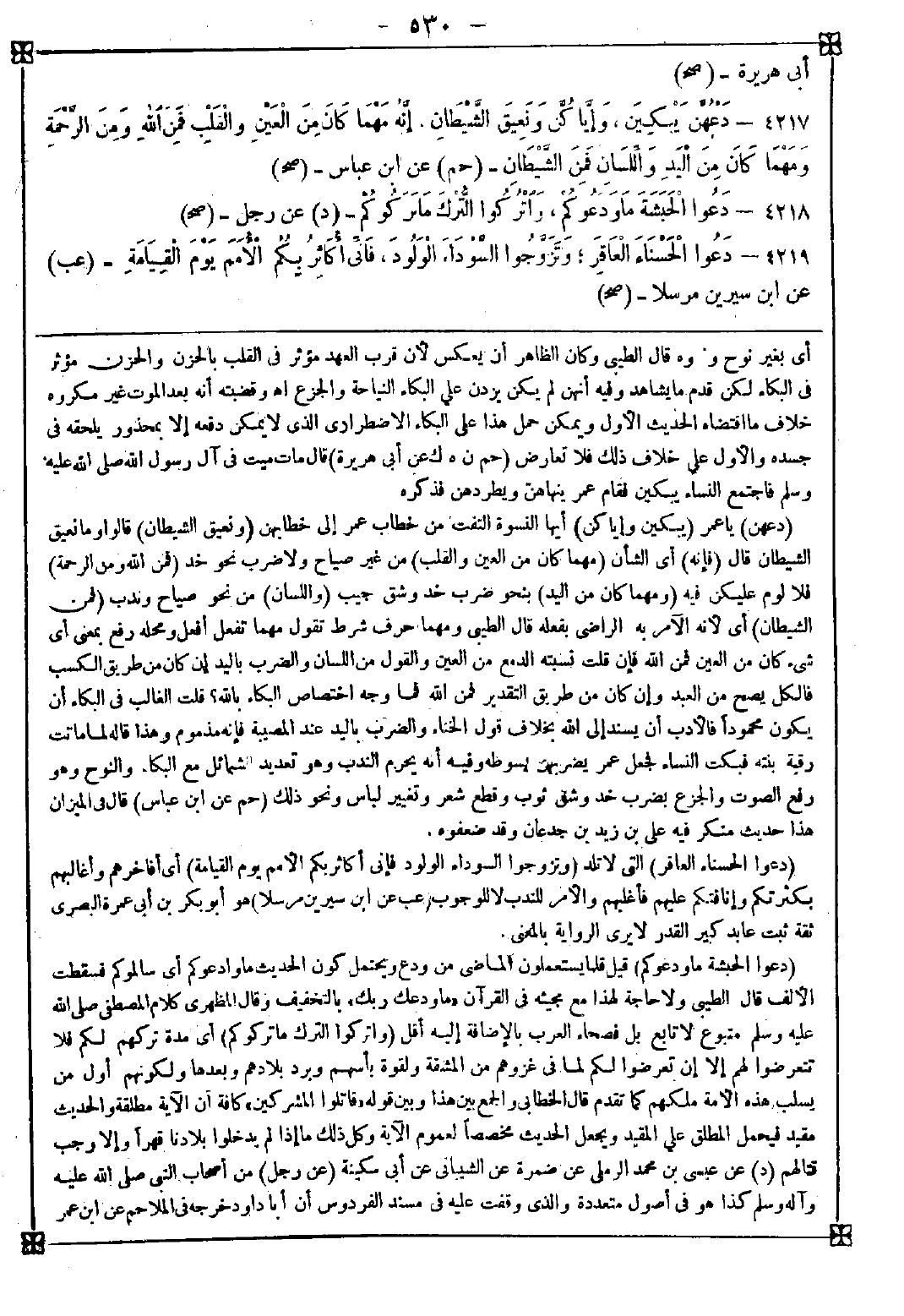 4217 - (دعهن) يا عمر (يبكين وإياكن) أيها النسوة التفت من خطاب عمر إلى خطابهن (ونعيق الشيطان) قالوا: وما نعيق الشيطان قال: (فإنه) أي الشأن (مهما كان من العين والقلب) من غير صياح ولا ضرب نحو خد (فمن الله ومن الرحمة) فلا لوم عليكن فيه (ومهما كان من اليد) بنحو خد وشق جيب (واللسان) من نحو صياح وندب (فمن الشيطان) أي لأنه الآمر به الراضي بفعله قال الطيبي: ومهما حرف شرط تقول مهما تفعل أفعل ومحله رفع بمعنى أي شيء كان من العين فمن الله فإن قلت: نسبته الدمع من العين والقول من اللسان والضرب باليد إن كان من طريق الكسب فالكل يصح من العبد وإن كان من طريق التقدير فمن الله فما وجه اختصاص البكاء بالله؟ قلت: الغالب في البكاء أن يكون محمودا فالأدب أن يسند إلى الله بخلاف قول الخناء والضرب باليد عند المصيبة فإنه مذموم وهذا قاله لما ماتت رقية بنته فبكت النساء فجعل عمر يضربهن بسوطه وفيه أنه يحرم الندب وهو تعديد الشمائل مع البكاء والنوح وهو رفع الصوت والجزع بضرب خد وشق ثوب وقطع شعر وتغيير لباس ونحو ذلك