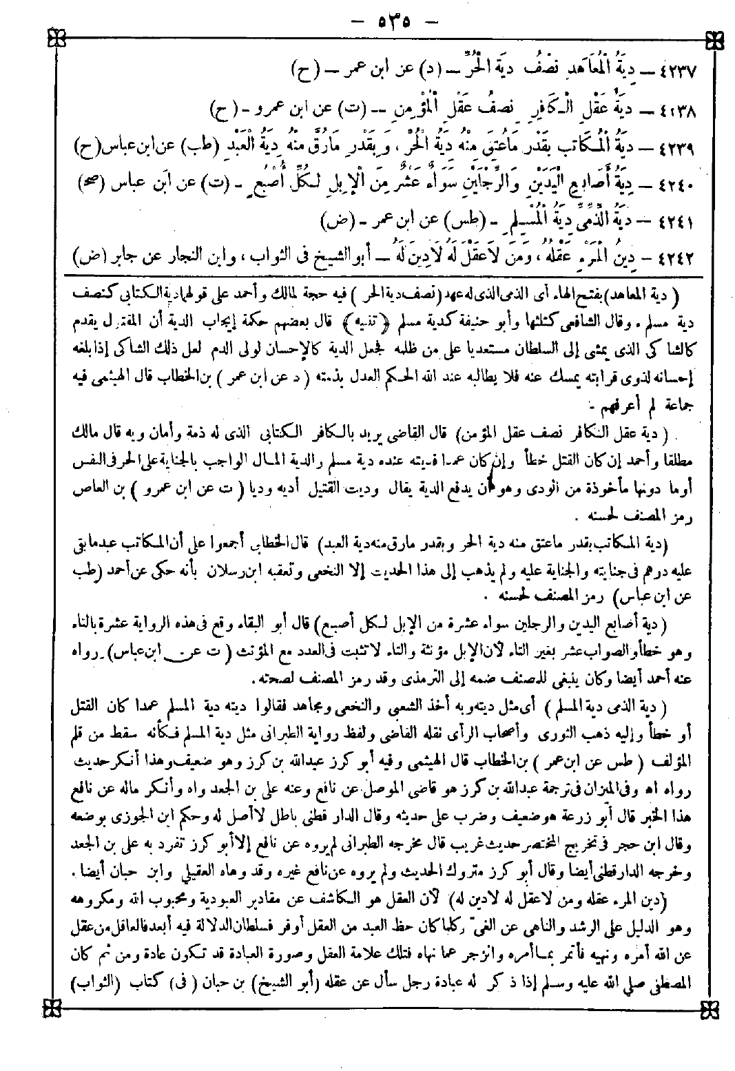 -[535]- 4237 - (دية المعاهد) بفتح الهاء أي الذمي الذي له عهد (نصف دية الحر) فيه حجة لمالك وأحمد على قولهما دية الكتابي كنصف دية مسلم. وقال الشافعي: كثلثها وأبو حنيفة: كدية مسلم <تنبيه> قال بعضهم: حكمة إيجاب الدية أن المتقول يقدم كالشاكي الذي يمشي إلى السلطان مستعديا على من ظلمه فجعل الدية كالإحسان لولي الدم لعل ذلك الشاكي إذا بلغه إحسانه لذوي قرابته يمسك عنه فلا يطالبه عند الله العدل بذمته