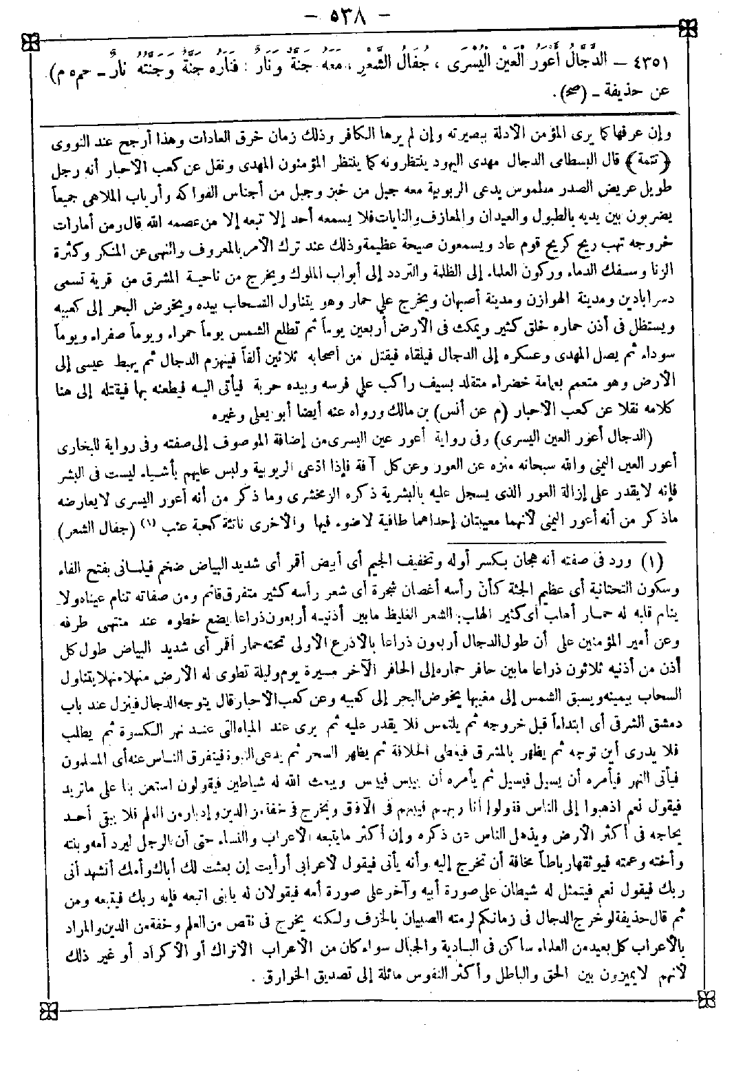 (1) ورد في صفته أنه هجان بكسر أوله وتخفيف الجيم أي أبيض أقمر أي شديد البياض ضخم فيلماني بفتح الفاء وسكون التحتانية أي عظيم الجثة كأن رأسه أغضان شجرة أي شعر رأسه كثير متفرق قائم ومن صفاته تنام عيناه ولا ينام قلبه له حمار أهلب أي كثير الهلب: الشعر الغليظ ما بين أذنيه أربعون ذراعا يضع خطوه عند منتهى طرفه وعن أمير المؤمنين علي أن طول الدجال أربعون ذراعا بالأذرع الأولى تحته حمار أقمر أي شديد البياض طول كل أذن من أذنيه ثلاثون ذراعا ما بين حافر حماره إلى الحافر الآخر مسيرة يوم وليلة تطوى له الأرض منهلا منهلا يتناول السحاب بيمينه ويسبق الشمس إلى مغيبها يخوض البحر إلى كعبيه وعن كعب الأحبار قال: يتوجه الدجال فينزل عند باب دمشق الشرقي أي ابتداءا قبل خروجه ثم يلتمس فلا يقدر عليه ثم يرى عند المياه التي عند نهر الكسوة ثم يطلب فلا يدرى أين توجه ثم يظهر بالمشرق فيعطي الحلافة ثم يظهر السحر ثم يدعي النبوة فيتفرق الناس عنه أي المسلمون فيأتي النهر فيأمره أن يسيل فيسيل ثم يأمره أن ييبس فييبس ويبعث الله له شياطين فيقولون استعن بنا على ما تريد فيقول نعم اذهبوا إلى الناس فقولوا أنا ربهم فيبثهم في الأفاق ويخرج في خفة من الدين وإدبار من العلم فلا يبقى أحد يحاجه في أكثر الأرض ويذهل الناس عن ذكره وإن أكثر ما يتبعه الأعراب والنساء حتى أن الرجل ليرد أمه وبنته وأخته وعمته فيوثقها رباطا مخافة أن تخرج إليه وأنه يأتي فيقول لأعرابي: أريت إن بعثت لك أباك وأمك أتشهد أني ربك فيقول: نعم فيتمثل له شيطان على صورة أبيه وآخر على صورة أمه فيقولان له: يا بني اتبعه فإنه ربك فيتبعه ومن ثم قال حذيفة: لو خرج الدجال في زمانكم لرمته الصبيان بالخزف ولكنه يخرج في نقص من العلم وخفة من الدين والمراد بالأعراب كل بعيد من العلماء ساكن في البادية والجبال سواء كان من الأعراب الأتراك أو الأكراد أو غير ذلك لأنهم لا يميزون بين الحق والباطل وأكثر النفوس مائلة إلى تصديق الخوارق