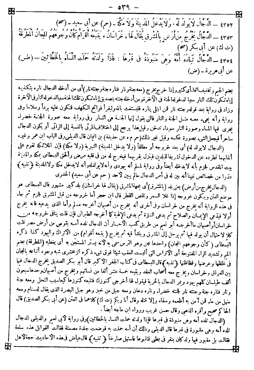 4253 - (الدجال يخرج من أرض) يعني بلد (بالمشرق) أي بجهة المشرق (يقال لها خراسان) بلد كبير مشهور قال البسطامي: هو موضع الفتن ويكون خروجه إذا غلا السعر ونقص القطر قال ابن حجر: أما خروجه من قبل المشرق فجزم ثم جاء في هذه الرواية أنه يخرج من خراسان وفي أخرى أنه يخرج من أصبهان أخرجه مسلم وأما الذي يدعيه فإنه يخرج أولا فيدعي الإيمان والصلاح ثم يدعي النبوة ثم يدعي الإلهية كما أخرجه الطبراني فإن قلت ينافي خروجه من خراسان أو أصبهان ما أخرجه أبو نعيم من طريق كعب الأحبار أن الدجال تلده أمه بقوص من أرض مصر قلت كلا لاحتمال أن يولد فيها ثم يرحل إلى المشرق وينشأ فيه ثم يخرج (يتبعه أقوام) من الأتراك واليهود كذا ذكره البسطامي (كأن وجوههم المجان) واحدها مجن وهو الترس سمي به لأنه يستر المستجن به أي يغطيه (المطرقة) بضم الميم وتشديد الراء المفتوحة أي الأتراس التي ألبست العقب شيئا فوق شيء ذكره الزمخشري شبه وجوه أتباعه بالمجان في غلظها وعرضها وفظاظتها <تنبيه> قال البسطامي في كتاب الجفر الأكبر: قال أبو بكر الصديق يخرج الدجال فيما بين العراق وخراسان ويخرج معه أصحاب العقد ويتبعه خمسة عشر ألفا من نسائهم ويخرج من أصبهان وحدها سبعون ألف طيلسان كلهم يهود ويمر الدجال بالخربة فيقول لها أخرجي كنوزك فتتبعه كنوزها كيعاسيب النحل ومعه جنة ونار فناره جنة وجنته نار فجنته خضراء وناره دخان ومعه جبل من خبز وهو جبل البصرة الذي يقال له سنام ومعه منهل من ماء فمن آمن به أطعمه وسقاه وإلا قتله وقال أنا ربكم