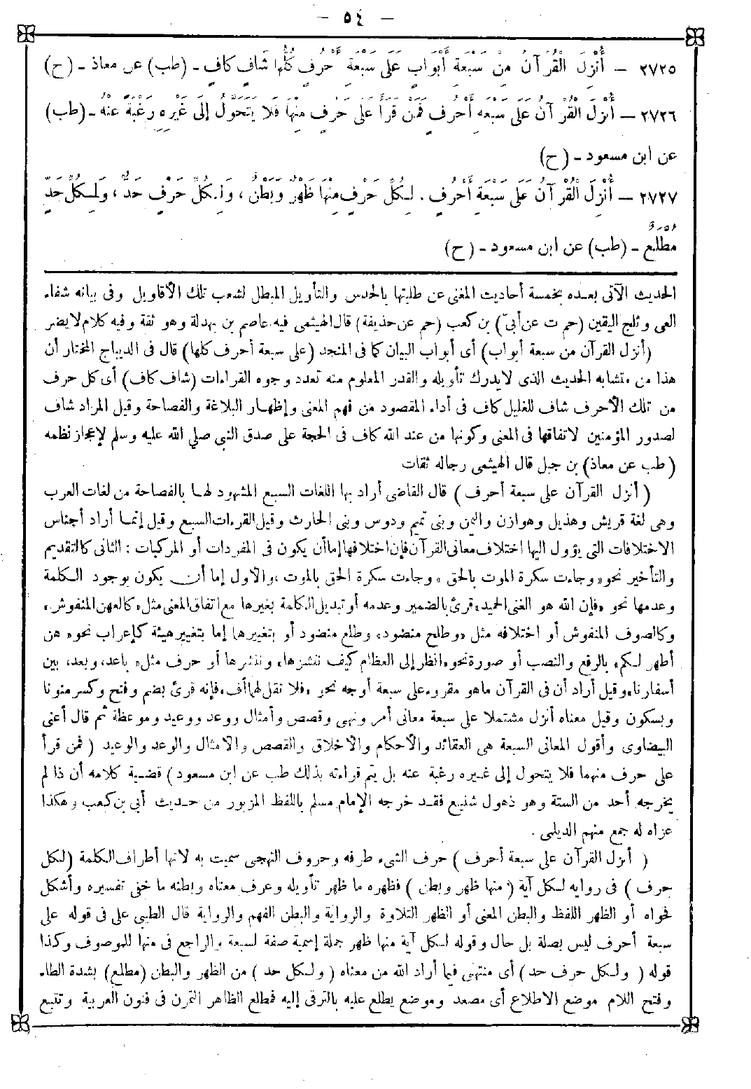 2727 - (أنزل القرآن على سبعة أحرف) حرف الشيء طرفه وحروف التهجي سميت به لأنها أطراف الكلمة (لكل حرف) في رواية لكل آية (منها ظهر وبطن) فظهره ما ظهر تأويله وعرف معناه وبطنه ما خفي تفسيره وأشكل فحواه أو الظهر اللفظ والبطن المعنى أو الظهر التلاوة والرواية والبطن الفهم والدراية. قال الطيبي: على في قوله على سبعة أحرف ليس بصلة بل حال وقوله لكل آية منها ظهر جملة اسمية صفة لسبعة والراجع في منها للموصوف وكذا قوله (ولكل حرف حد) أي منتهى فيما أراد الله من معناه (ولكل حد) من الظهر والبطن (مطلع) بشدة الطاء وفتح اللام موضع الاطلاع أي مصعد وموضع يطلع عليه بالترقي إليه فمطلع الظاهر التمرن في فنون العربية وتتبع -[55]- أسباب النزول والناسخ والمنسوخ وغير ذلك ومطلع الباطن تصفية النفس والرياضة والعمل بمقتضاه وقيل المنع ومعناه أن لكل حد من حدود الله وهي ما منع عباده من تعديه موضع إطلاع من القرآن فمن وفق لإرتقاء ذلك المرتقى اطلع على الحد الذي يتعلق بذلك المطلع. <تنبيه> قال ابن عربي: اغطس في بحر القرآن إن كنت واسع النفس وإلا فاقتصر على مطالعة كتب التفسير لظاهره ولا تغطس فتهلك فإن بحره عميق ولولا قصد الغاطس للمواضع القريبة من الساحل ما خرج لكم أبدا فالأنبياء والورثة هم الذين يقصدون هذه المواضع رحمة بالعالم وأما الواقفون الذين وصلوا ومسكوا ولم يردوا ولم ينتفع بهم أحد ولا انتفعوا بأحد بل قصدهم بشج البحر فغطسوا فهم إلى الأبد لا يخرجون