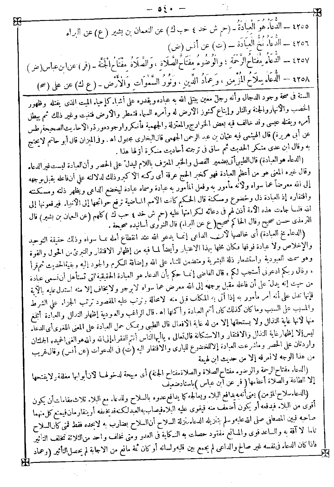 4255 - (الدعاء هو العبادة) قال الطيبي: أتى بضمير الفصل والخبر المعرف باللام ليدل على الحصر وأن العبادة ليست غير الدعاء وقال غيره: المعنى من هو أعظم العبادة فهو كخبر الحج عرفة أي ركنه الأكبر وذلك لدلالته على أن فاعله يقبل بوجهه إلى الله معرضا عما سواه ولأنه مأمور به وفعل المأمور به عبادة وسماه عبادة ليخضع الداعي ويظهر ذلته ومسكنته وافتقاره إذ العبادة ذل وخضوع ومسكنة قال الحكيم: كانت الأمم الماضية ترفع حوائجها إلى الأنبياء فيرفعونها إلى الله فلما جاءت هذه الأمة أذن لهم في دعائه لكرامتها عليه