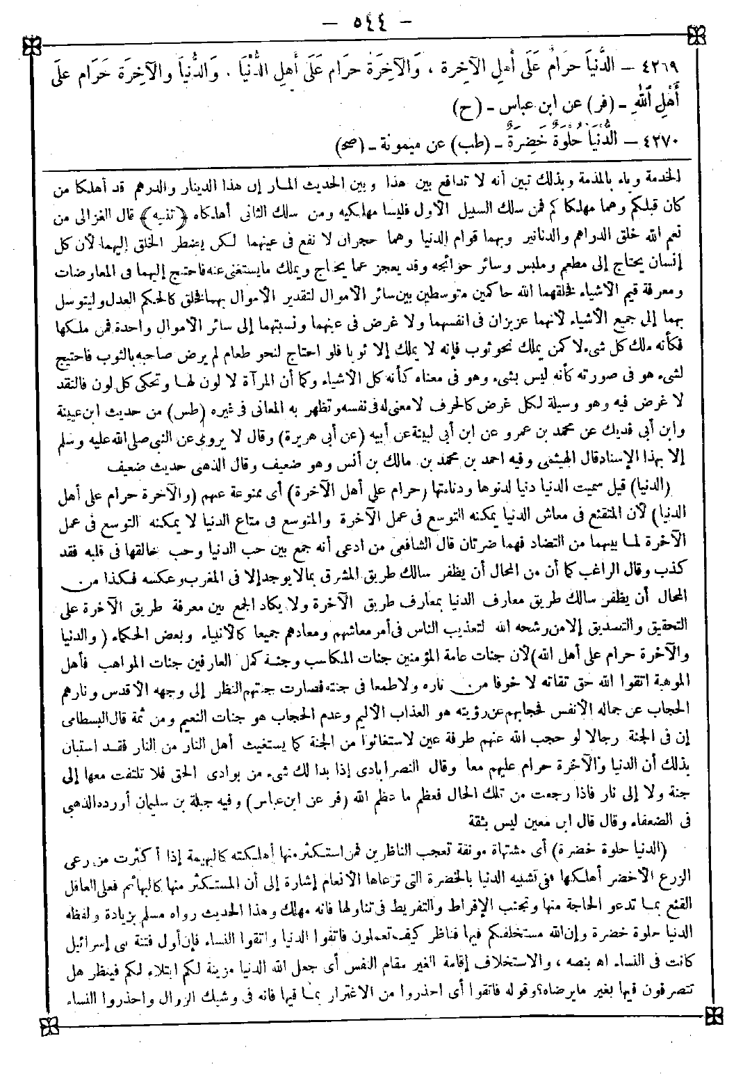4270 - (الدنيا حلوة) أي مشتهاة مونقة تعجب الناظرين فمن استكثر منها أهلكته كالبهيمة إذا أكثرت من رعي الزرع الأخضر أهلكها ففي تشبيه الدنيا بالخضرة التي ترعاها الأنعام إشارة إلى أن المستكثر منها كالبهائم فغلى العاقل القنع بما تدعو الحاجة منها وتجنب الإفراط والتفريط في تناولها فإنه مهلك وهذا الحديث رواه مسلم بزيادة ولفظه الدنيا حلوة خضرة وإن الله مستخلفكم فيها فناظر كيف تعملون فاتقوا الدنيا واتقوا النساء فإن أول فتنة بني إسرائيل كانت في النساء اه بنصه والاستخلاف إقامة الغير مقام النفس أي جعل الله الدنيا مزينة لكم وابتلاء لكم فينظر هل تتصرفون فيها بغير ما يرضاه؟ وقوله فاتقوا أي احذروا من الاغترار بما فيها فإنه في وشيك الزوال واحذروا النساء -[545]- وقبول قولهن فإنهن ناقصات عقل وقوله أول فتنة بني إسرائيل هي أن رجلا اسمه عائيل طلب من ابن أخيه أو ابن عمه أن يزوجه بنته فأبى فقتله لينكحها وقيل لينكح زوجته وهو الذي نزلت فيه آية البقرة <تنبيه> هل الدنيا ما على الأرض إلى قيام الساعة أو كل موجود قبل الحشر أو ما أدرك حسا والآخرة ما أدرك عقلا أو ما فيه شهوة للنفس؟ رجح النووي الثاني وبعض المحققين ما قبل الآخر