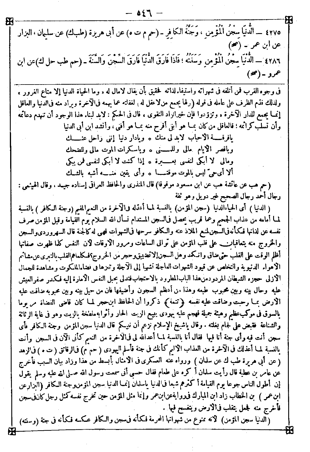 4276 - (الدنيا سجن المؤمن) لأنه ممنوع من شهواتها المحرمة فكأنه في سجن والكافر عكسه فكأنه في جنة (وسنته) -[547]- بفتح أوله (فإذا فارق الدنيا) بالموت (فارق السجن والسنة) بفتح السين المهملة القحط والجدب هكذا ضبطه الزركشي في اللآلئ وتبعه المؤلف في شرح الصدور قال بعض العارفين: الدنيا سجن للمؤمن إن شعر به وضيق فيه على نفسه طلبت السراج منه إلى الآخرة فليسعد ومن لم يشعر بأنها سجن فوسع فيها على نفسه طلبت البقاء فيها وليست بباقية فيشقى. ولما مات داود الطائي سمعت الهتفة تقول أطلق داود من السجن وقال بعض الصوفية: حق ملك الموت أن نحييه بالسلام فإنه سبب في خلاصنا من عالم الكون والفساد فحقه عظيم وشكره لازم وحكي أن قوما من الأوائل كانوا يعظمون زحلا بالتقديس ويقولون لا يعين على الحياة العرضية بل هو سبب إنقاذنا من الدنيا الدنية