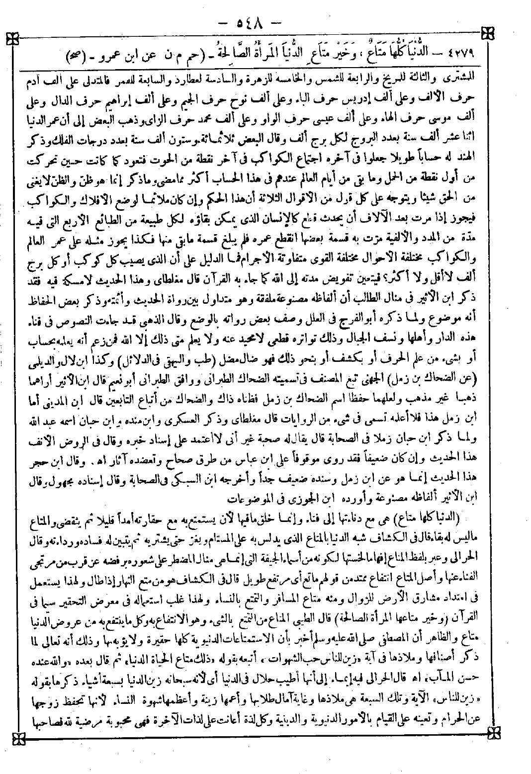 4279 - (الدنيا كلها متاع) هي مع دناءتها إلى فناء وإنما خلق ما فيها لأن يستمتع به مع حقارته أمدا قليلا ثم ينقضي والمتاع ما ليس له بقاء قال في الكشاف: شبه الدنيا بالمتاع الذي يدلس به على المستام ويغر حتى يشتريه ثم يتبين له فساده ورداءته وقال الحرالي: وعبر بلفظ المتاع إفهاما لخستها لكونه من أسماء الجيفة التي إنما هي مثال المضطر على شعوره برفضه عن قرب من مرتجي الفناء عنها وأصل المتاع انتفاع ممتد من قولهم ماتع أي مرتفع طويل قال في الكشاف: هو من متع النهار إذا طال ولهذا يستعمل في امتداد مشارق الأرض للزوال ومنه متاع المسافر والتمتع بالنساء ولهذا غلب استعماله في معرض التحقير سيما في القرآن (وخير متاعها المرأة الصالحة) قال الطيبي: المتاع من التمتع بالشيء وهو الانتفاع به وكل ما ينتفع به من عروض الدنيا متاع والظاهر أن المصطفى صلى الله عليه وسلم أخبرنا بأن الاستمتاعات الدنيوية كلها حقيرة ولا يؤبه بها وذلك أنه تعالى لما ذكر أصنافها وملاذها في آية {زين للناس حب الشهوات} أتبعه بقوله {ذلك متاع الحياة الدنيا} ثم قال بعده {والله عنده حسن المآب} اه قال الحرالي: فيه ايماء إلى أنها أطيب حلال في الدنيا أي لأنه سبحانه زين الدنيا بسبعة أشياء ذكرها بقوله {زين للناس} الآية وتلك السبعة هي ملاذها وغاية آمال طلابها وأعمها زينة وأعظمها شهوة النساء لأنها تحفظ زوجها عن الحرام وتعينه على القيام بالأمور الدنيوية والدينية وكل لذة أعانت على لذات الآخرة فهي محبوبة مرضية لله فصاحبها -[549]- يلتذ بها من جهة تنعمه وقرة عينه بها ومن وجهة إيصالها له إلى مرضاة ربه وإيصاله إلى لذة أكمل منها قال الطيبي: وقيد بالصالحة إيذانا بأنها شر المتاع لو لم تكن صالحة وقال الأكمل: المراد بالصالحة النقية المصلحة لحال زوجها في بيته المطيعة لأمره