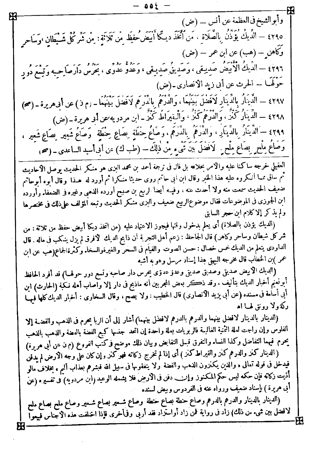 4296 - (الديك الأبيض صديقي وصديق صديقي وعدو عدوي يحرس دار صاحبه وتسع دور حولها) قد أفرد الحافظ أبو نعيم أخبار الديك بتأليف وقد ذكر بعض المجربين أنه ما ذبح في دار إلا وأصاب أهله نكبة